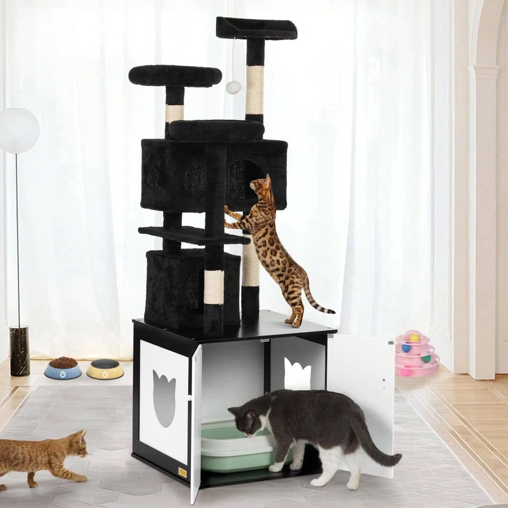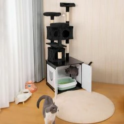 Our COZIWOW 2 In 1 Cat Tree with Litter Box Cabinet can meet all the daily needs of your cats. The multi-level cat tree features a dangling ball, 3 top perches, 2 cat houses, a platform and sisal posts, giving your furry friends multiple activity spaces to do what they love. Plus, there is a large cabinet at the bottom that you can use as a cat bathroom to hide a cat litter box, or as a locker to store cat supplies or add mats for a large cat condo. From climbing, scratching, hiding, napping to toileting, your cats can spend the whole day on this cat furniture. Perfect for placing in your living room or bedroom.
