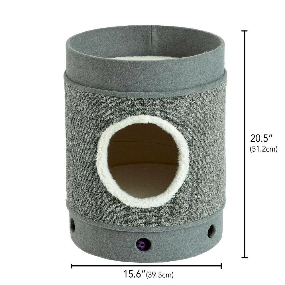 The Hawthorne is a cozy one story cat condo that offers comfort and claw friendly space all in 1. Gives your cat a place to hide or hang out, plus an appropriate place to scratch. Padded floor inside the condo and on the roof to provide cozy options. The Hawthorne is 20.5 in. tall and 15.6 in. W That makes it small enough to tuck out of the way, but large enough to accommodate any feline friend. Sturdy construction means years of use. Neutral grey color to compliment any decor. Comes ready to use.