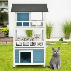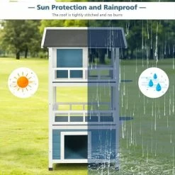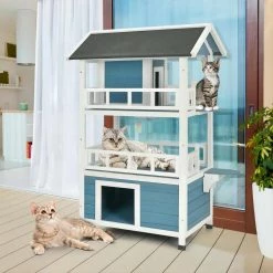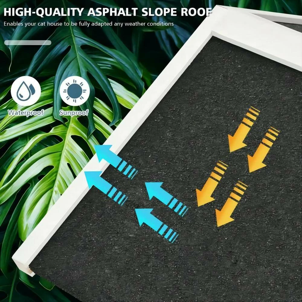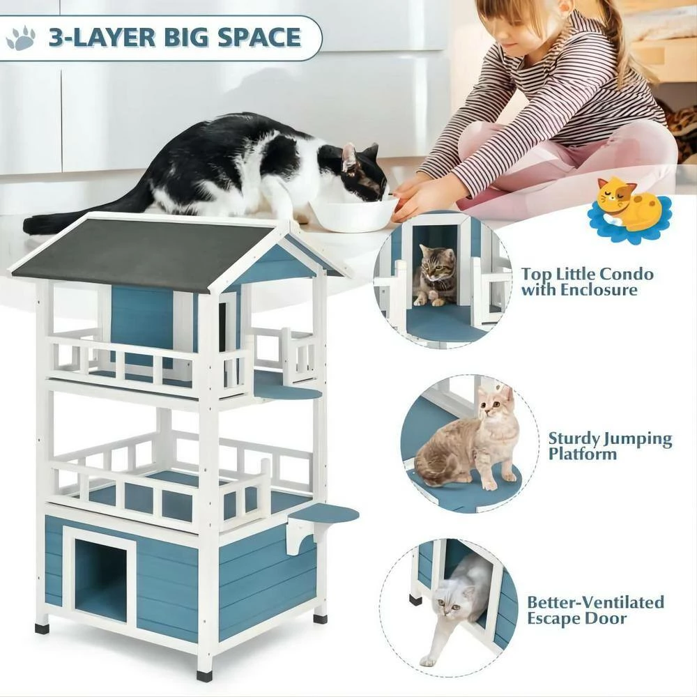 This 3-tier cat house has 2 warm apartments that can be used for sleeping, providing enough resting space. There are 2 escape doors and 2 spacious fences to help your cat escape quickly when needed, allowing you to catch and observe your pet. In addition, the house is equipped with 2 jumping platforms, providing a place to jump up and down. Using high-quality fir and engineered wood, and coated with environmentally friendly waterproof paint, to ensure that it is durable and not affected by the weather. The sloping asphalt roof and raised plastic feet can withstand bad weather and provide long-lasting durability. Easy to assemble, with pre-drilled holes and detailed instructions, the total size after installation is 24 in. L x 24 in. W x 50 in. H.