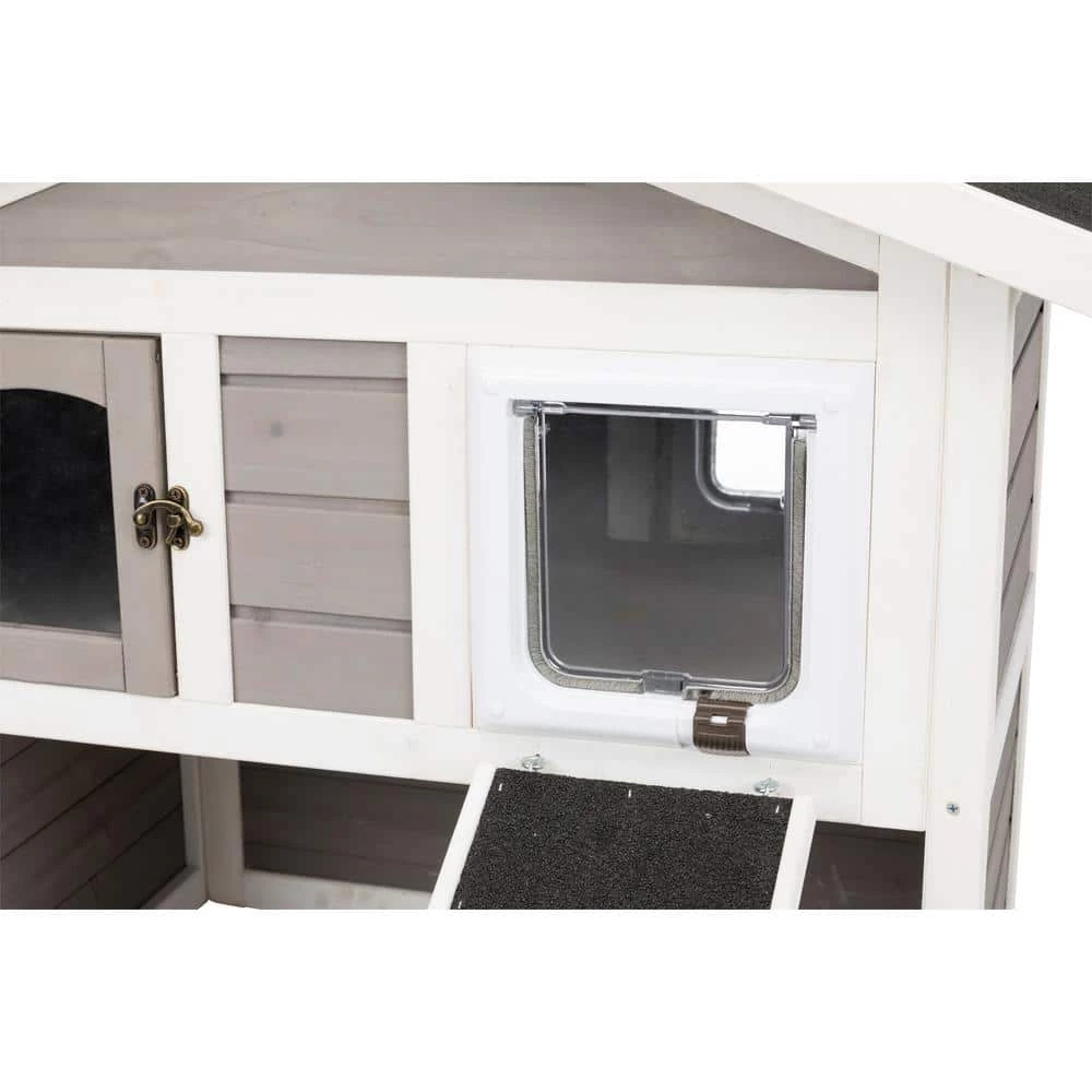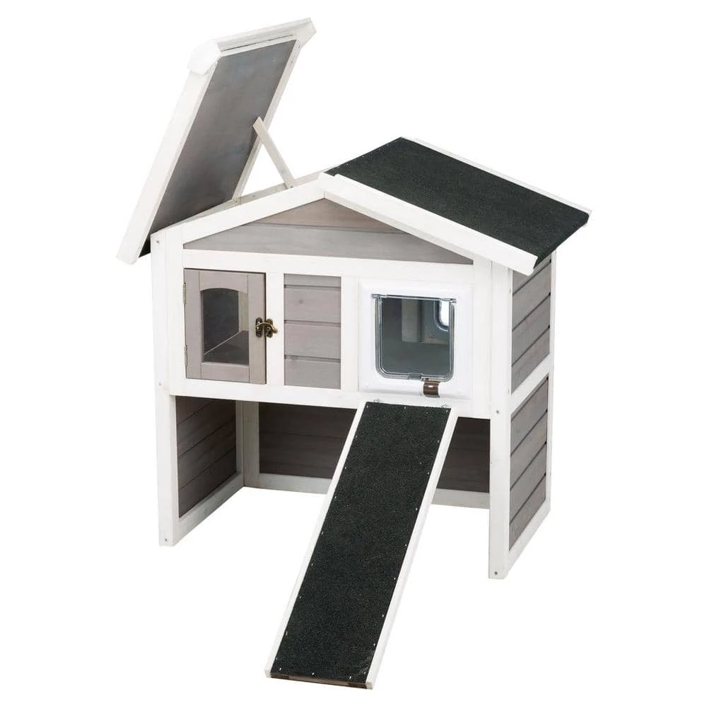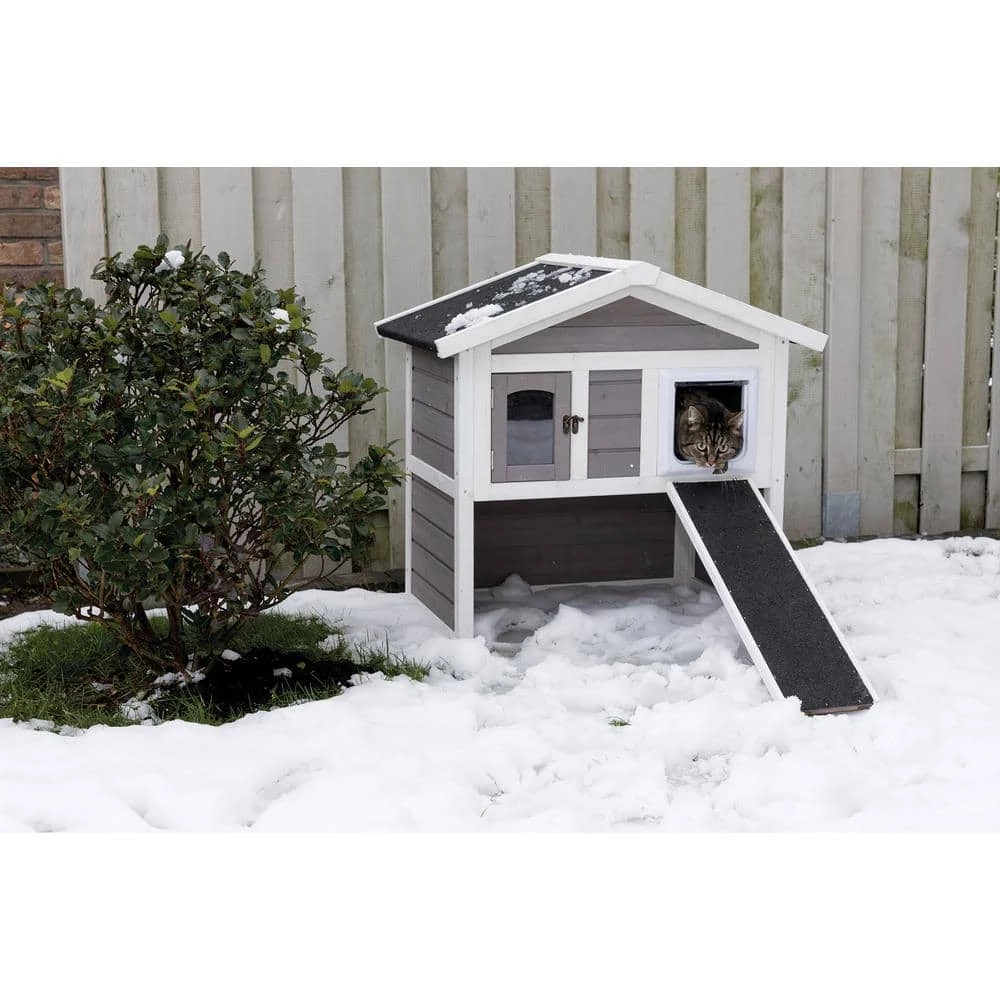 The TRIXIE Insulated Cat Home provides cats and other small pets with a secure and relaxed environment to play or retreat. Constructed with foam insulation and weather-treated non-toxic fir wood keeps the weather out and provides a mild climate inside. This adorable home will endure years of use with very little maintenance. Its functional design allows cats to lounge comfortably underneath the condo or retreat inside for a perfect get-away. The house features 3 exit points so your feline friend can sneak out whenever they please. The elevated foundation promotes air circulation and protects your cat from ground chill and wet conditions.