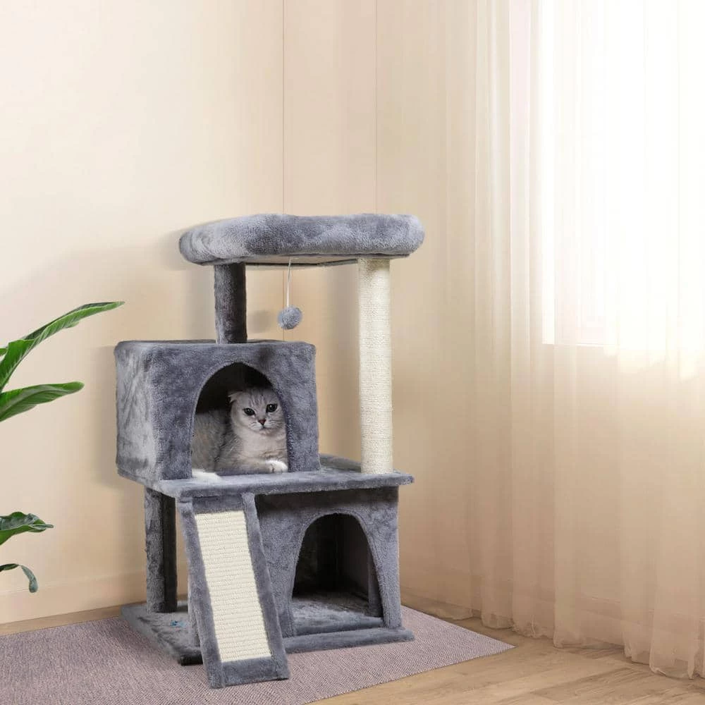 The Play Cat Tree from COZIWOW gives your cat a perfect paradise to nap, scratch, jump. Designed with multi-functional 3-tier. Crafted from premium particle board with soft pet-friendly flannel covering 2 hidden condos, top viewing perch, dangling pom-pom toy, natural sisal post and sisal-covered ramp board, which meets your feline desire, they can sleep comfortably and play freely while liberating their instinct for scratching. Don’t hesitate to give your beloved cats such a wonderful gift to enrich their life.