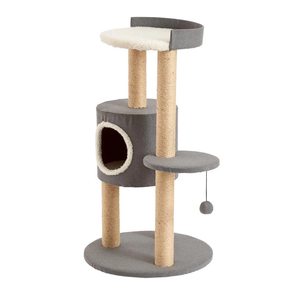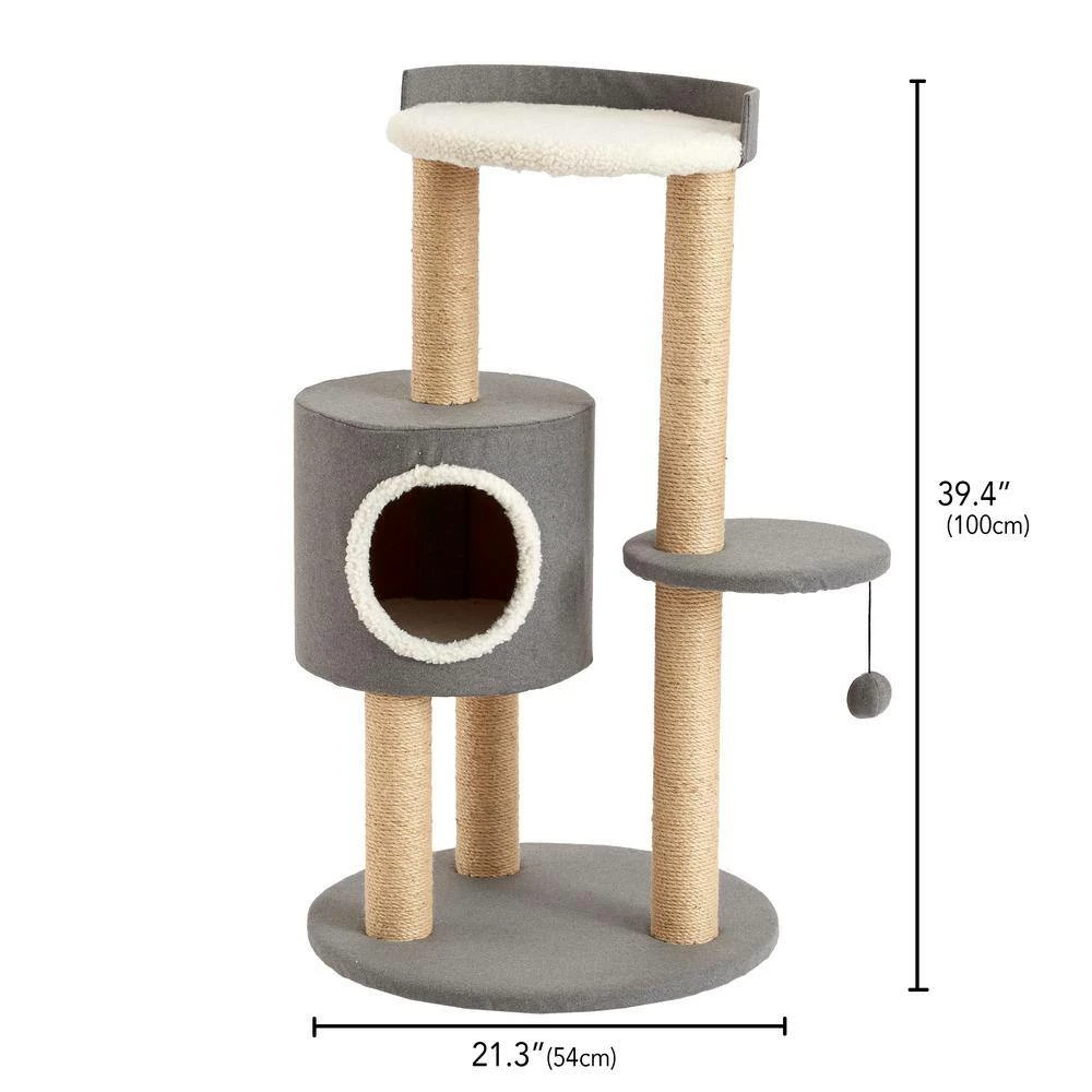 The 39.4 in. Oak Cat Tree with Condo features 4 tiers which gives your feline friends the perfect place for cat naps, scratching, perching or playing. Jute columns are cat claw friendly and help keep those claws away from your furniture. Platforms give your cat(s) a place to perch and play. The attached condo is a cozy place for quiet cat naps. The Oak is 39.4 in. tall and 21.3 in. W. Quick and easy assembly.