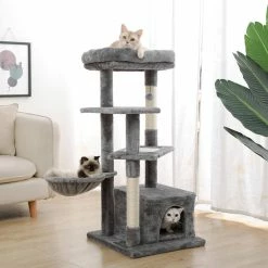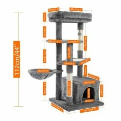 Our wooden multi-level cat tower is a versatile wonderland perfectly for your furry friends to stretch, climb and play to their heart’s content. It is designed to expand purring possibilities with the private and spacious cat condo, firmly dangling ball, durable sisal covered scratching posts and pad, along with the plush perch inspire your lazy kittens to be active for hours and hours. This all-in-1 activity center also comes with a cozy hammock and private roomy condo which bring endless warmth and ease for our cats.