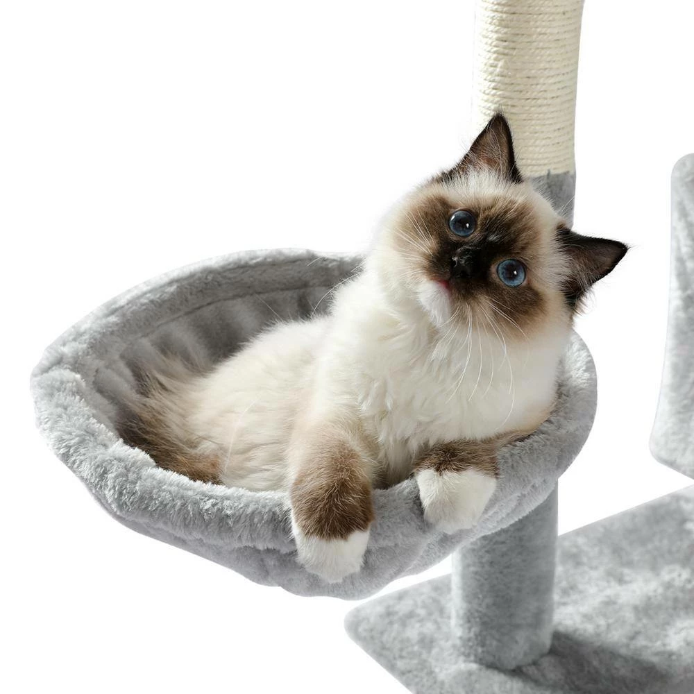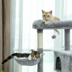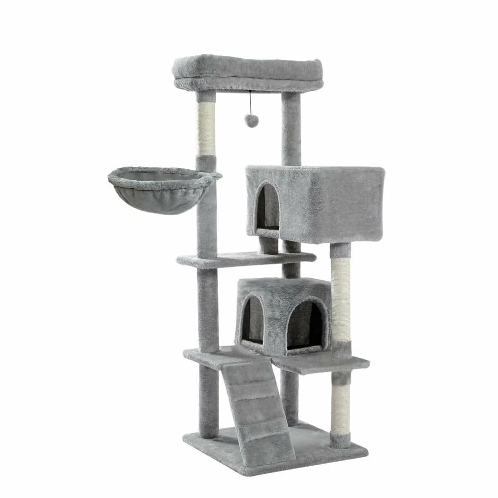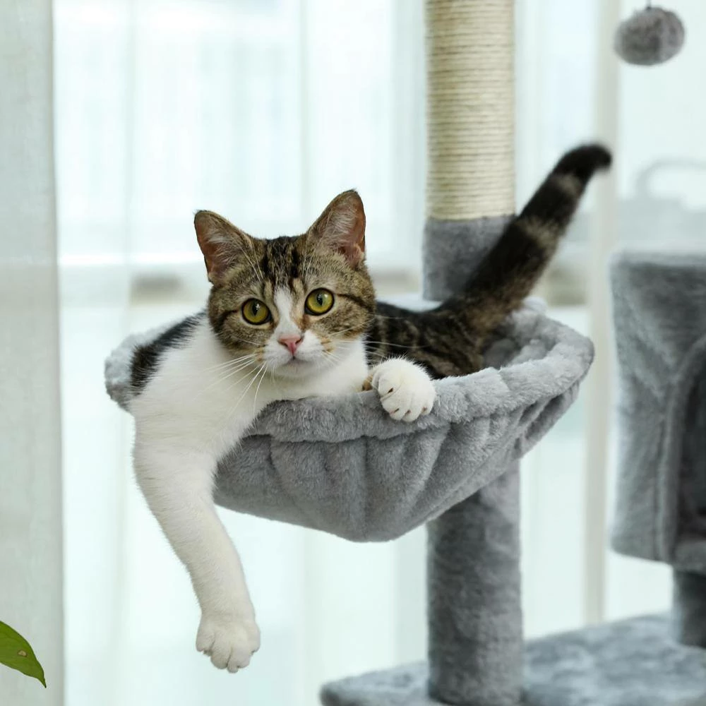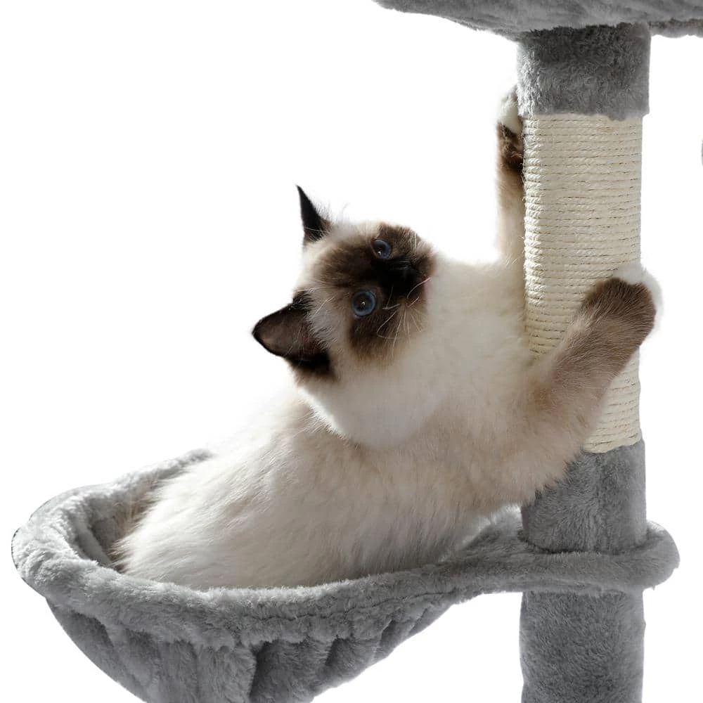 The 56.30 in. Cat Tree has a super large top perch 2 condos and a hammock that provide enough spots for adult cats and small cat to rest and sleep. And its 6 levels structure could provide enough platforms for your little wild furry baby to climb jump and satisfy their daily activities. The natural sisal scratching poles provide them a workout to sharpen their nail and help them keep health while the dangling balls add the extra thrill and fun. It is easy to set up with step-step instruction. And we provide 1-Year Warranty for all parts except dangling balls. So you can buy and use it with confidence.