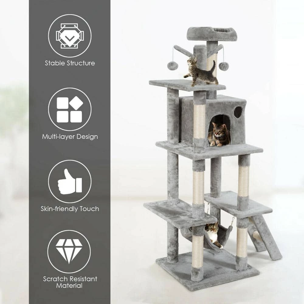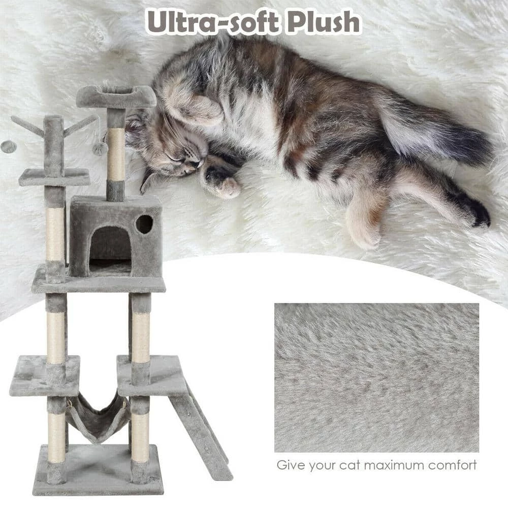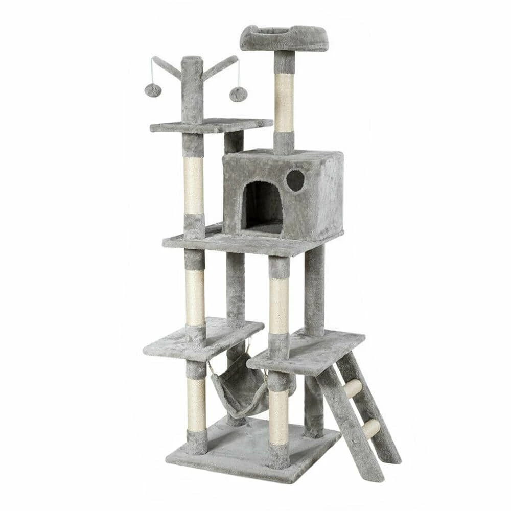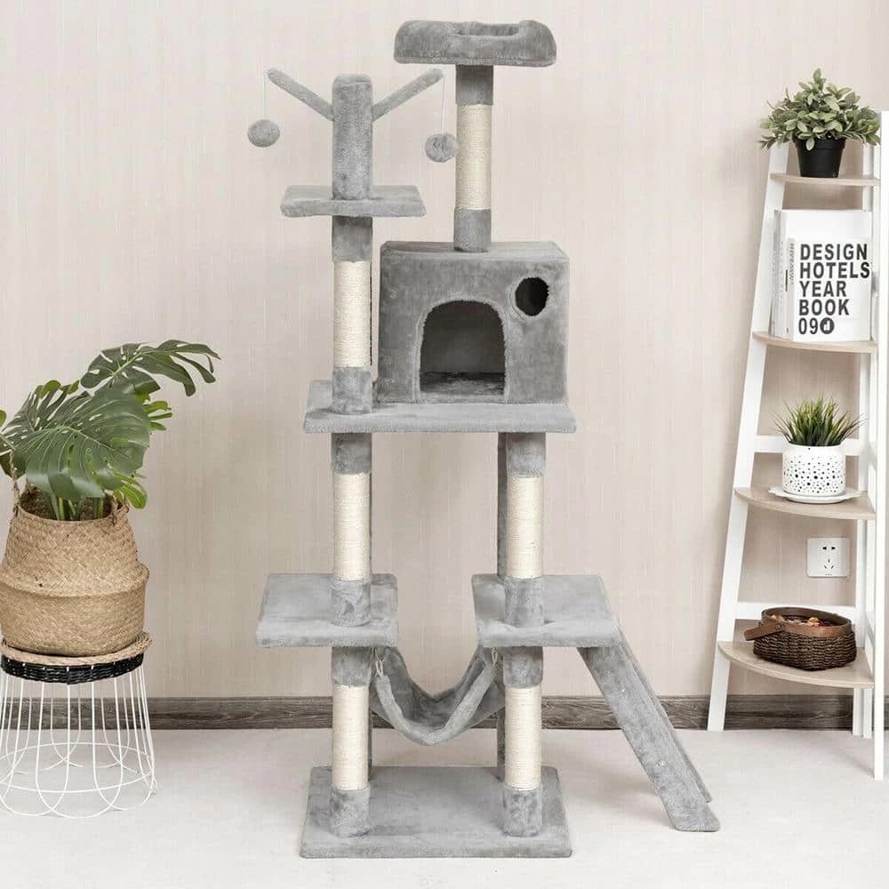 This cat tree is made of natural sword twine and soft flannelette, which perfectly fits the nature of kittens and gives people a gentle touch. The multi-level design of this cat tree with apartment and platform gives cats more space to move around. Hammocks, interactive scratching toys and small ladders give cats more fun. In addition, this simple cat tree is suitable for all kinds of home decoration styles.