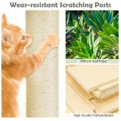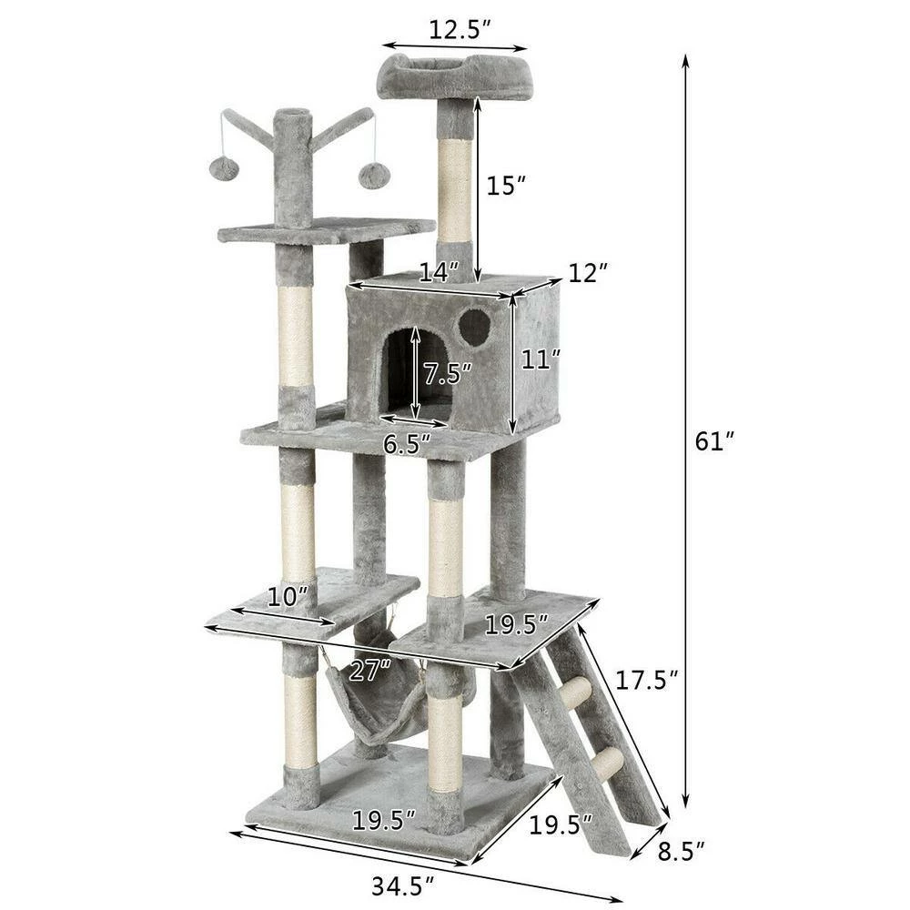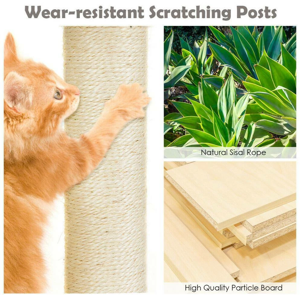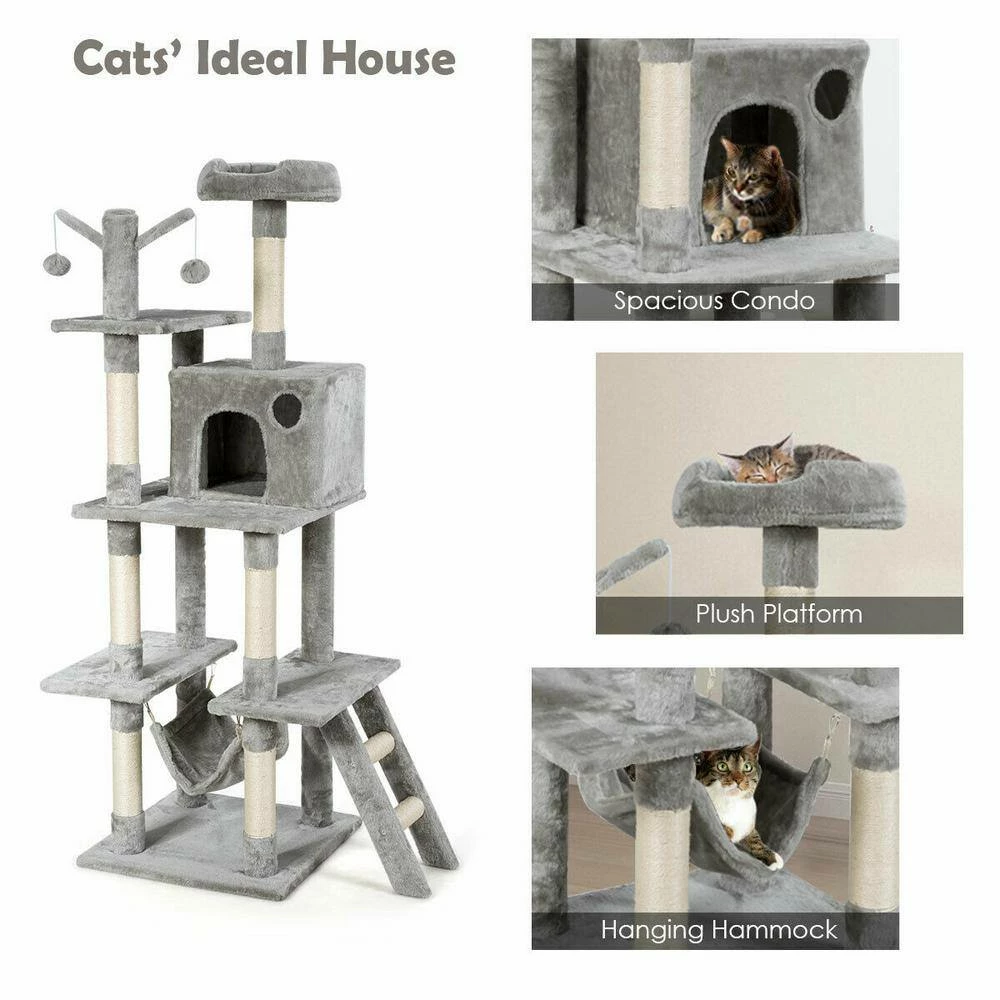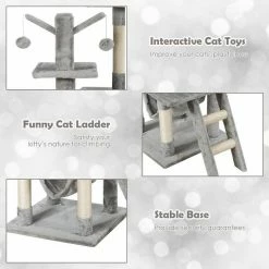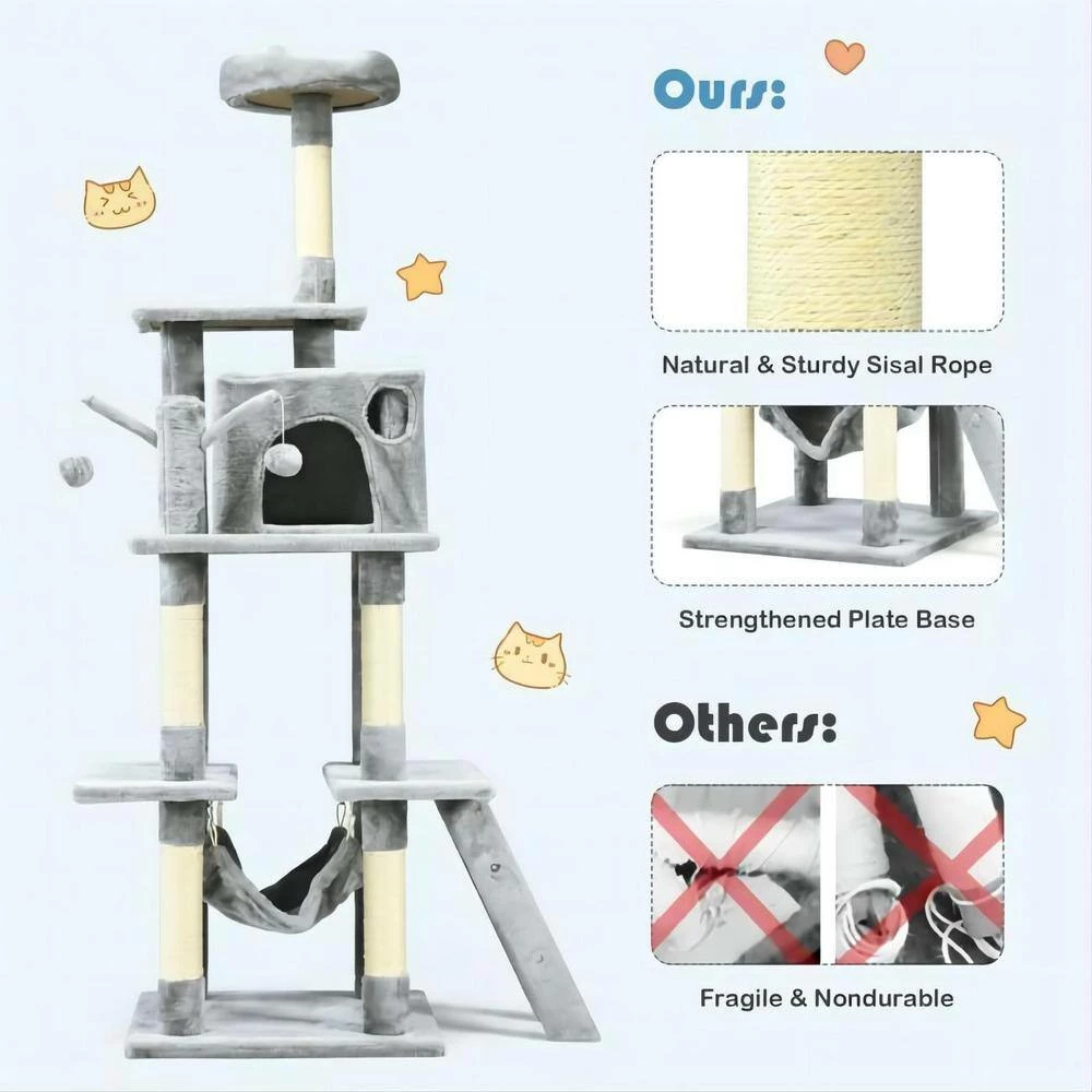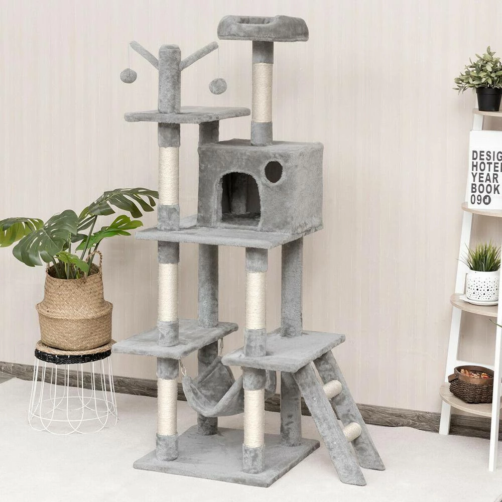 This cat climbing tree is made of high-quality particleboard, which is strong and durable, has a strong load-bearing capacity, and provides safety protection. This cat tree uses natural sisal rope and soft plush cloth, which perfectly fits the nature of kittens and gives a gentle touch. The multi-level design of this cat tree with apartments and platforms gives cats more space for activities. Hammock, interactive scratching toys and small ladders give cats more fun. In addition, the simple style is suitable for all kinds of home decoration. With detailed instructions, easy to assemble.