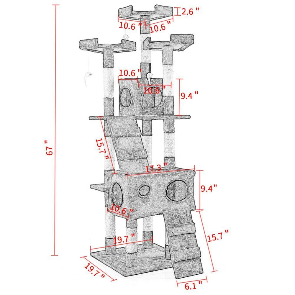 If you’re in the market for a cozy condo for your feline friend, then our 67 in. cat tree is exactly what you’re looking for. Our kitten climbing tower is designed to offer endless fun to your cats. It comes with 2 large condo houses, 3 relaxing perches with raised edging and 2 climbing ladders, which perfect meets your cat’s needs for jumping or napping. In addition, this cat condo provides both sturdiness with chipboard and softness with plush. The wear-resistant natural sisal covered posts satisfy cats’ instinct of nail sharpening and protect your furniture from cats’ claw. Other than that, the hanging mouse toy also offers extra-fun. Just take our stylish cat tree to decorate your home.