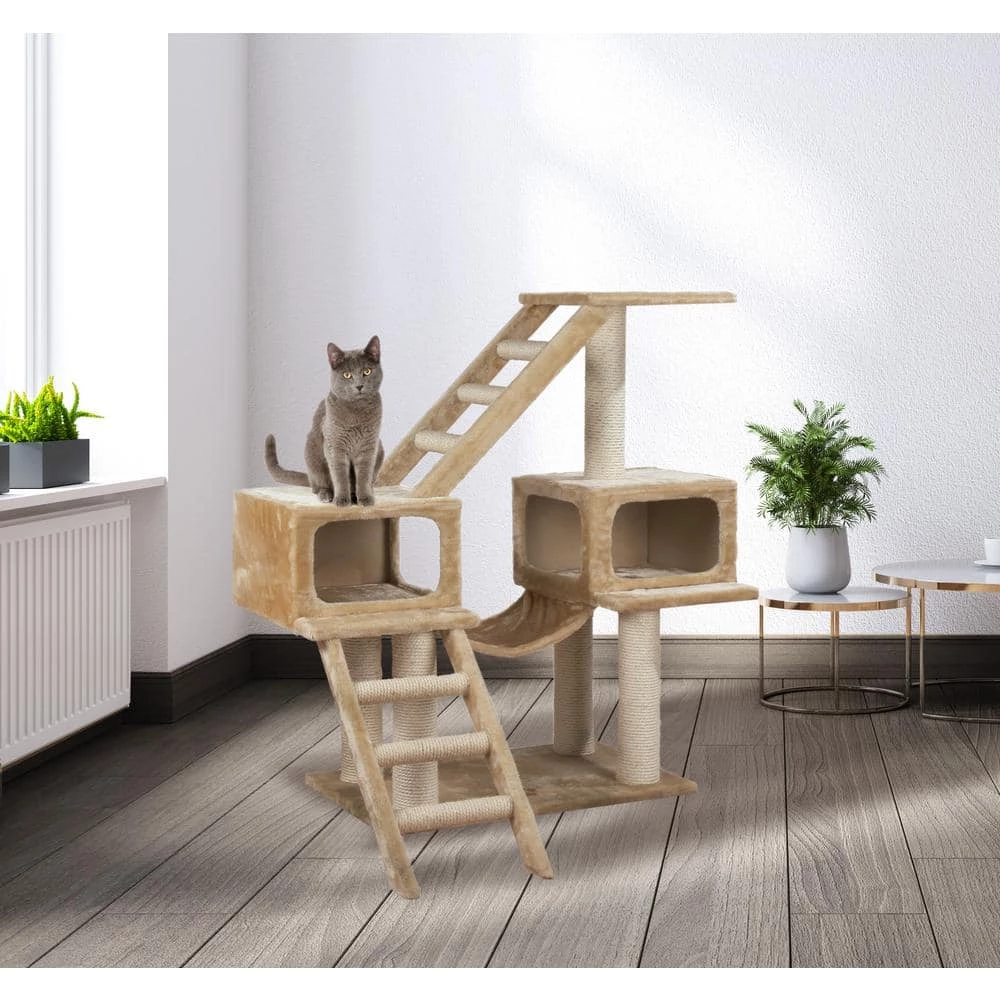 The TRIXIE Malaga Cat Playground provides endless opportunities for cats to climb, scratch, and relax while owners can enjoy watching them play and explore. You’ll enjoy watching your cat climb to new heights with each sisal wrapped ladder as much as your cat will enjoy the long rewarding naps in the hammock and plush condos. Cats can sharpen their claws on any one of the five scratching posts instead of on your furniture or carpet, giving them a healthy outlet for their scratching instincts. All posts are covered in durable sisal. If a nap or place to hide is in order, the cat can crawl inside one of two kitty condos with multiple entryways. Both are covered with plush both inside and out, making them the perfect cozy retreat. We’ve also included a plush hammock for added comfort. Feeling a little spunky? Jump, climb or perch atop one of the plush covered platforms and lie in wait for unsuspecting prey or simply enjoy the view. The ladders with sisal wrapped steps lead up to each platform. The subtle earth tones of the sisal and plush fabric also make this piece of cat furniture easy to integrate into your home decor. Dimensions: 28 x 18 x 43 inches. Weight: 49 lbs. Additional Dimensions: 1 base 27.5 x 17.5 in; 5 sisal posts 3.5 x 15.75 in; 2 ladders with sisal steps 11.25 x 24 in; 1 hammock 18.5 x 11.75 in; 2 condos 14 x 10 x 17.5 in; 1 platform 14 x 14 in.