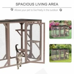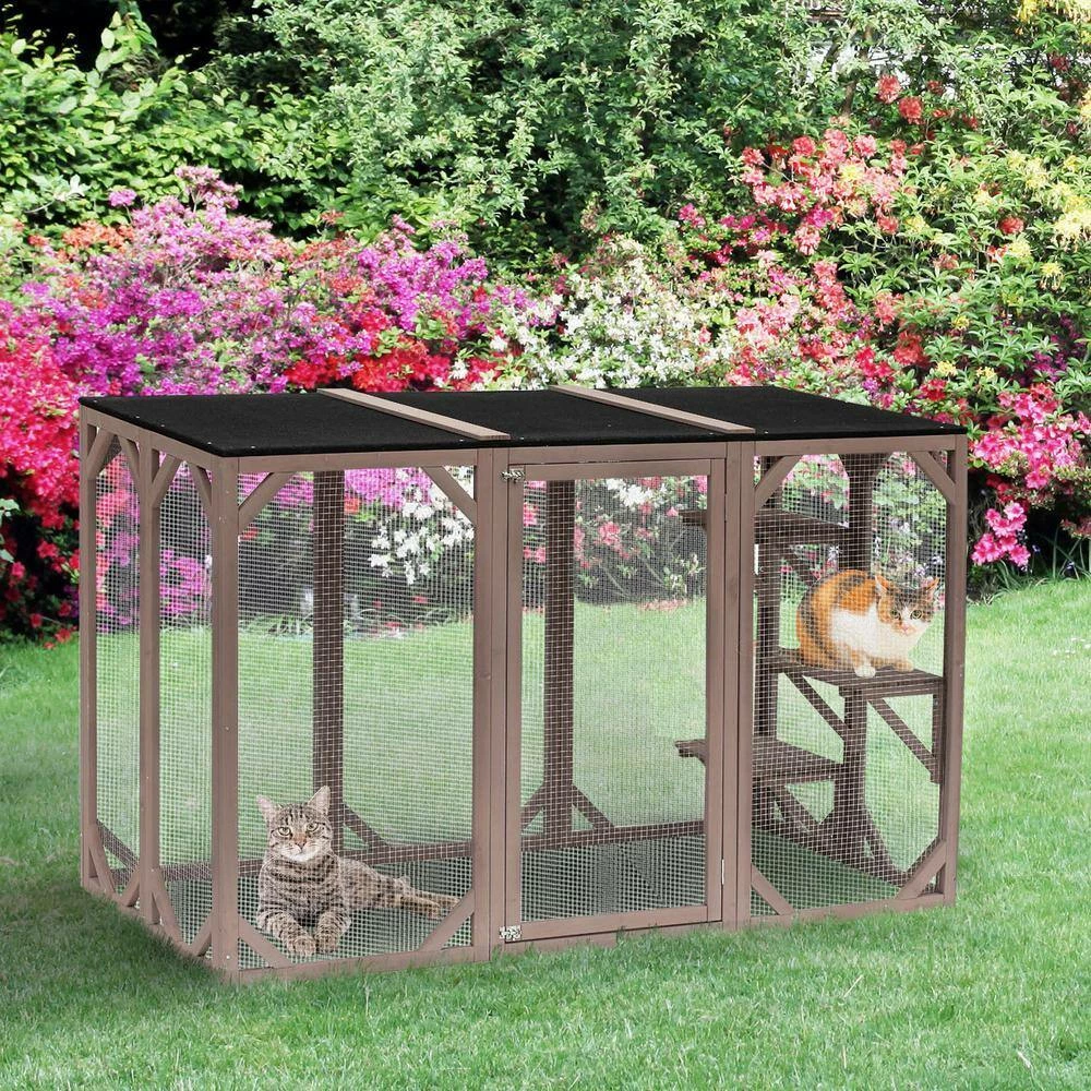 This PawHut cat house lets you open the back door patio for your kitties, giving them their own catio to roam around in. The large space can give furry felines a place to play while the sunlight streams in. Offering room to walk around, combined with triple tiered ledges, this mesh cat box enclosure will gift your pets the luxury of climbing and lounging in the fresh air. For their comfort, the asphalt roof protects against dreaded cat-hated rainwater, while the housing keeps them safe outside.