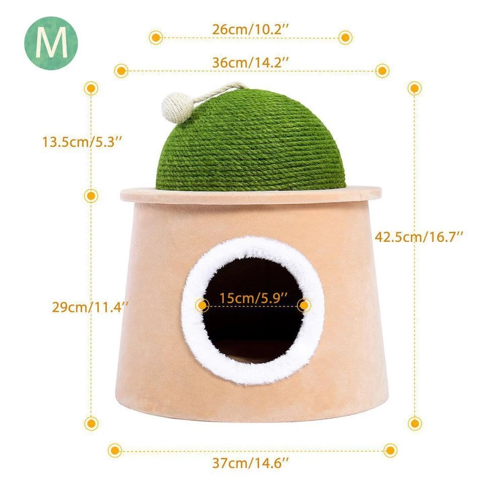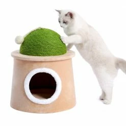 Due to the stool design, this cat tree has a very special appearance. When the green semi-circular side of the scratching board is facing up, the cat tree looks like a cactus, which is very cute in appearance, if you turn this scratching board upside down, the green and semicircular scratching board of this scratcher can get into the cylinder perfectly. At this time, the shape of this cat tree is like a stool. It can be used for cats and people to sit on it. It has a cute appearance and good practicability at the same time. The cushion built-into the cat tree is very soft. Cats can rest and sleep in cylindrical cubicles and the material of the cylindrical inner surface is different from the outer plush. The cat can scratch the inner surface with its paws. In addition, their claws can be scratched on the green semi-circular scratching plate and there is also a sisal ball for chewing and playing.