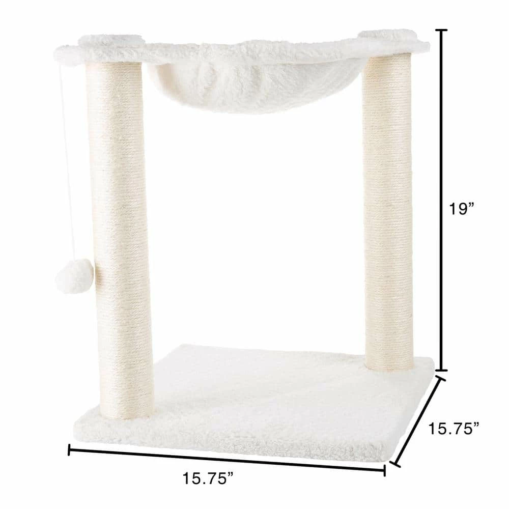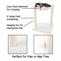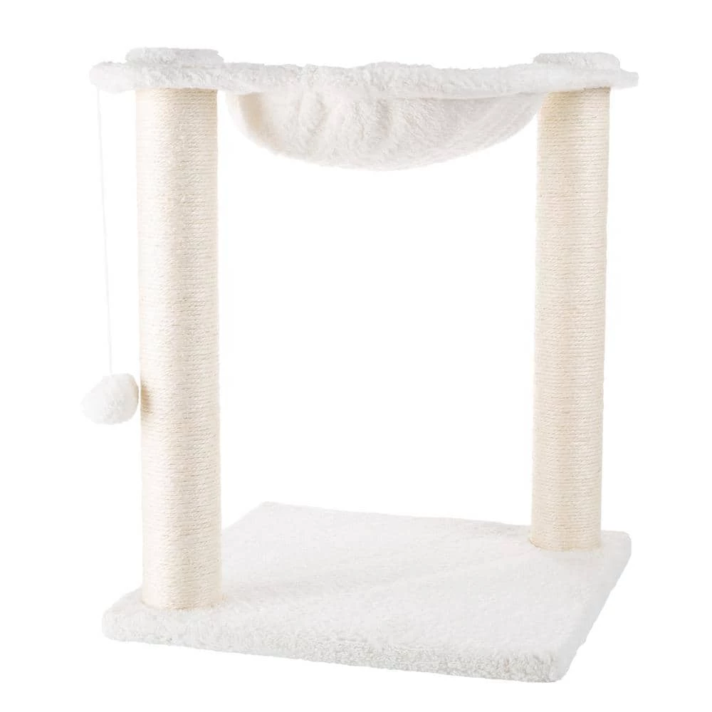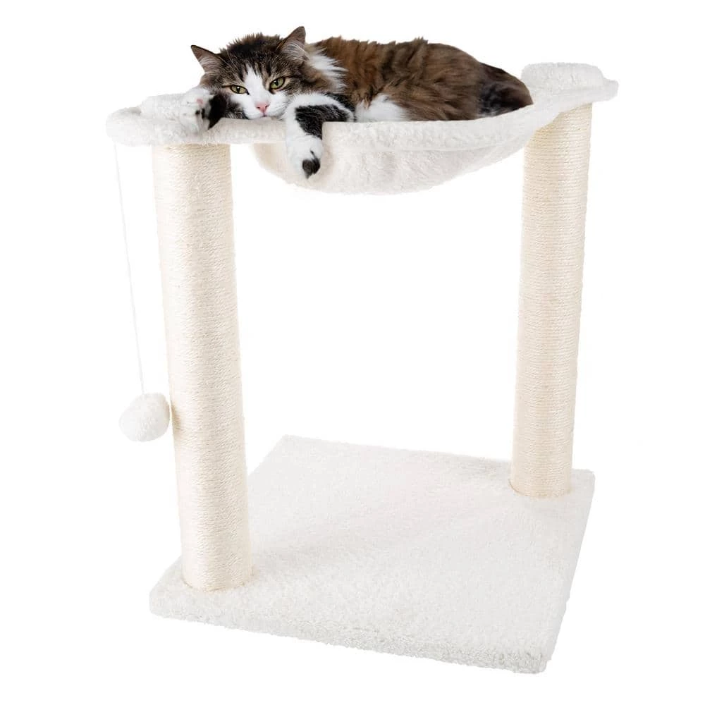 Give your cat or kitten the perfect place to nap, scratch, and play with the PETMAKER Cat Hammock and Scratching Posts. Cat trees help to encourage physical activity, mental stimulation, and satisfy your cats senses and natural instincts. This attractive cat activity tree features two large sisal rope scratchers to help provide an outlet for scratching, promote healthy claws and protect your furniture and carpet. It also features a hanging toy ball for interactive play and a cozy hammock-style bed for lounging to offer your cat their own slice of kitty paradise! It is easy to assemble for convenience and is covered in soft plush fabric for maximum comfort for your feline-friend.