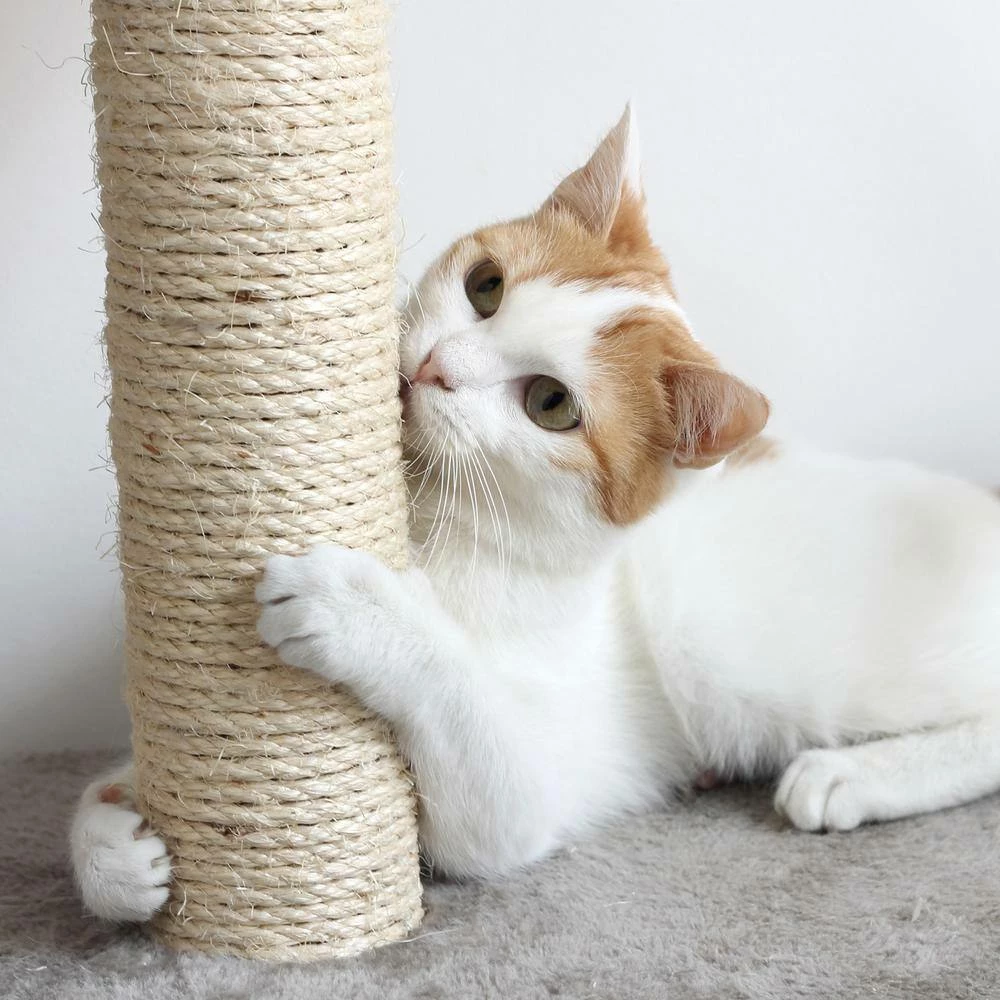 - Particle board construction covered in 100% polyester plush fabric, sisal scratching post