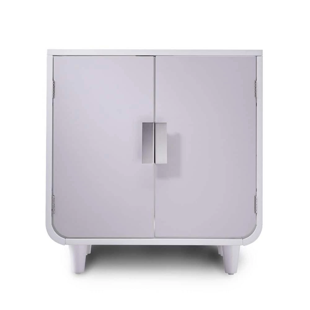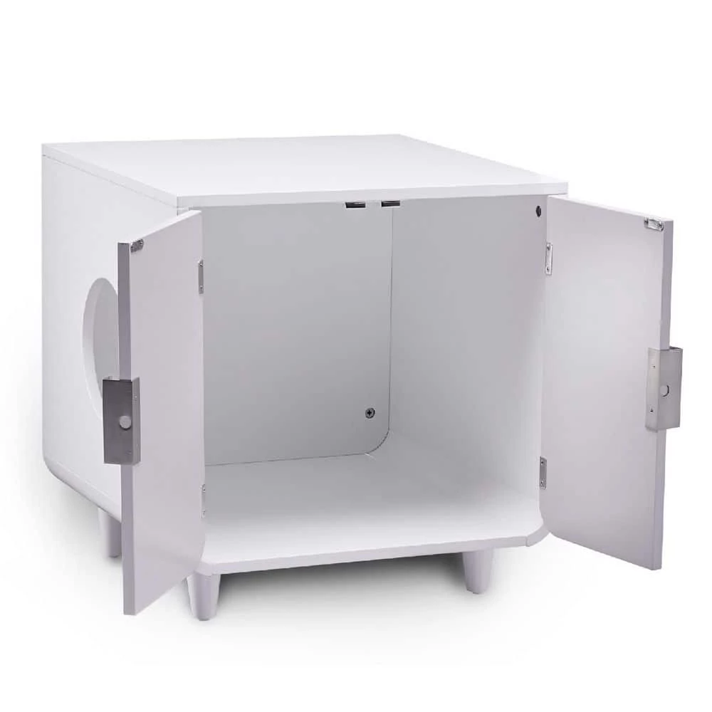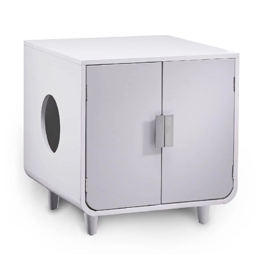 Give your furry friends some privacy while adding contemporary decor to your home with the Teamson Pets Dyad Mid Century Wooden Cat Litter Box Cabinet and Side Table. This sleek pet litter box features a classic mid-century design with a white finish and gray accents for a modern addition to any space. This versatile piece of furniture can be used to house a litter box or a pet bed while also functioning as a side table. The large hole on the side of the litter box allows easy entry and exit for convenient use, and its rounded corners keep you and your furry friends safer. The two cabinet doors on the front of this box provide instant access to change litter or put in a pet bed.