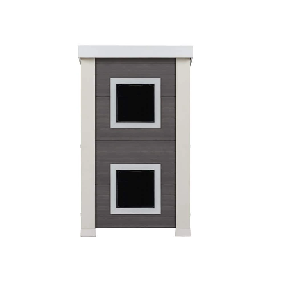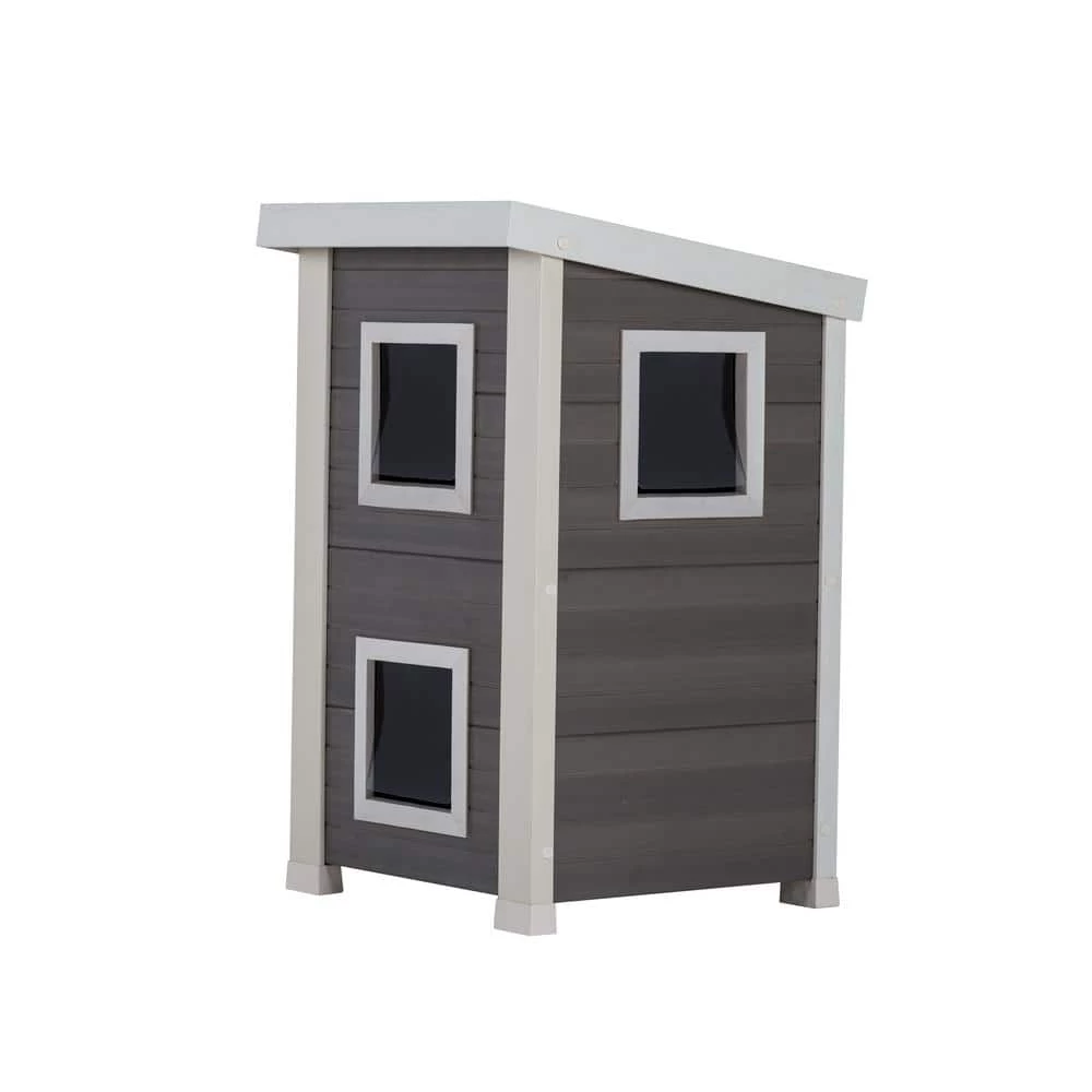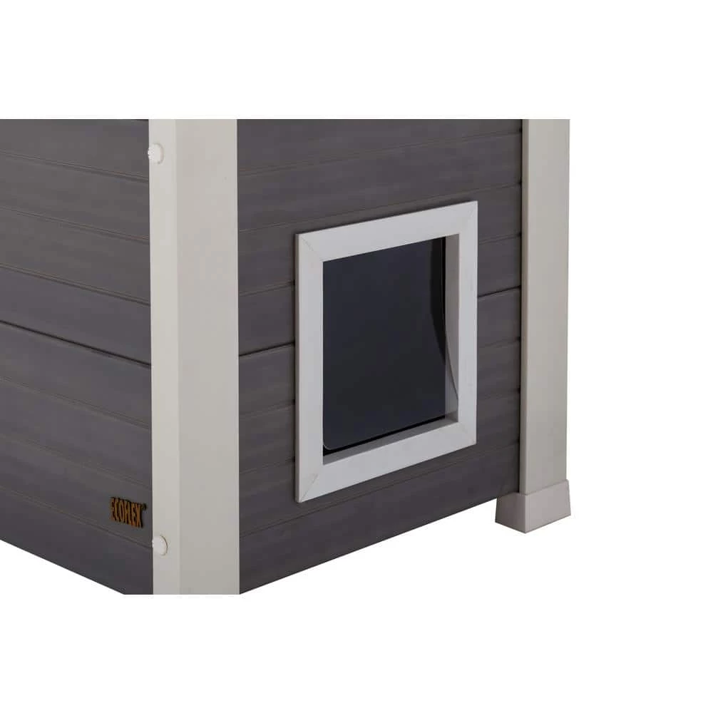 Townhouse living for the outdoor cats. This ECOFLEX Outdoor Cat Town House is the perfect shelter for your own outdoor cat or the neighborhood feral (stray) cats. Keep the outdoor kitties safe from the elements. The ECOFLEX outdoor feral cat townhouse is perfect for cats that need shelter from the elements. This house will withstand the elements and provide comfort and security to outdoor cats. ECOFLEX is a propriety formula that incorporates reclaimed wood and plastic. ECOFLEX is 100% non toxic and does not absorb moisture. There is nothing in ECOFLEX that could harm your pets or in this case, strays. Easy no tools assembly. Removable roof for easy care and maintenance. 10-year limited manufacturer warranty.