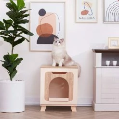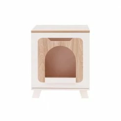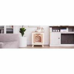 - Included: 2-toned mid-century modern enclosure that doubles as an end table and as a litter box, featuring splayed legs, easy-access entrance, easy-open door and vented sides