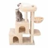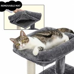 This elegant Cat tree stands 34 in. Tall comes with reinforced bottom base ensure its stability. It has the detachable ball and removable cover for easy replacement and easy care. The extra large top perch with raised cushion rim offer maximum comfort for feline friend while they are lounging and looking out window They will definitely enjoy it.
