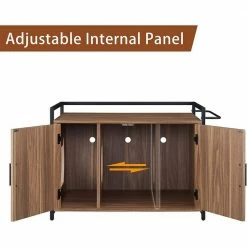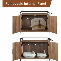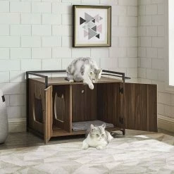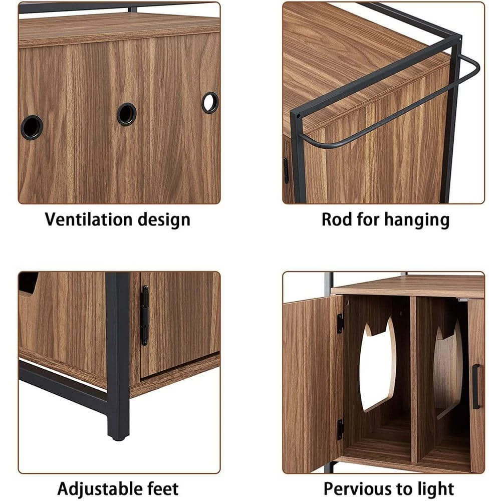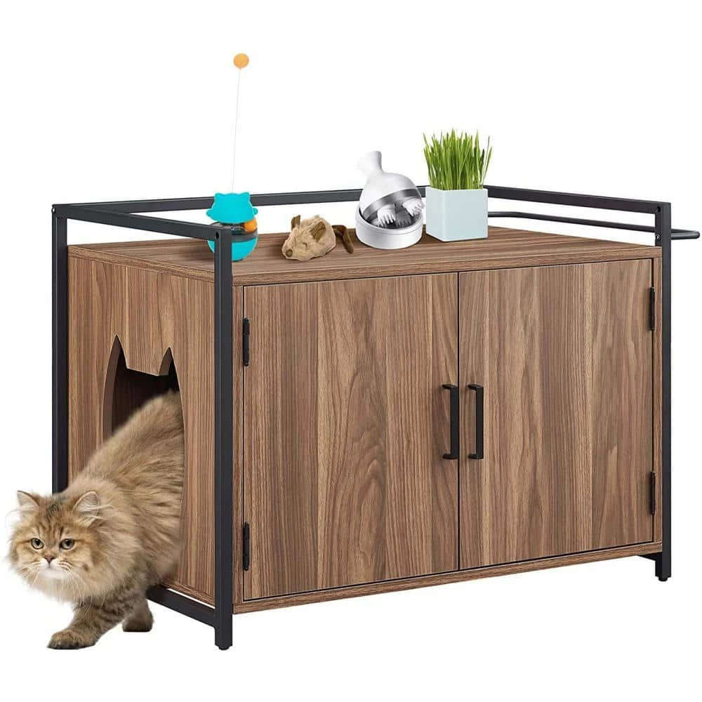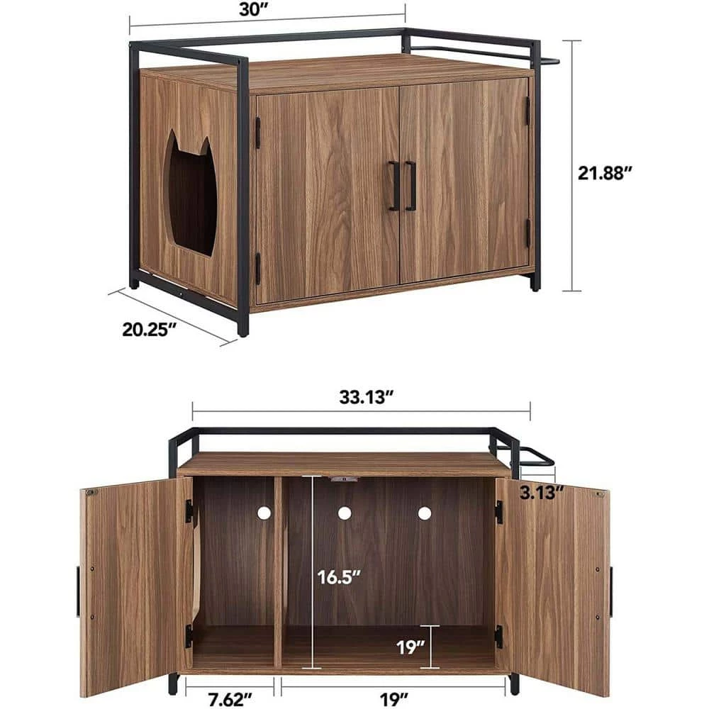 - Available in weathered walnut for a more modern look, which has a traditional feel, this cat litter enclosure is made with manufactured wood and has black iron framework for stability