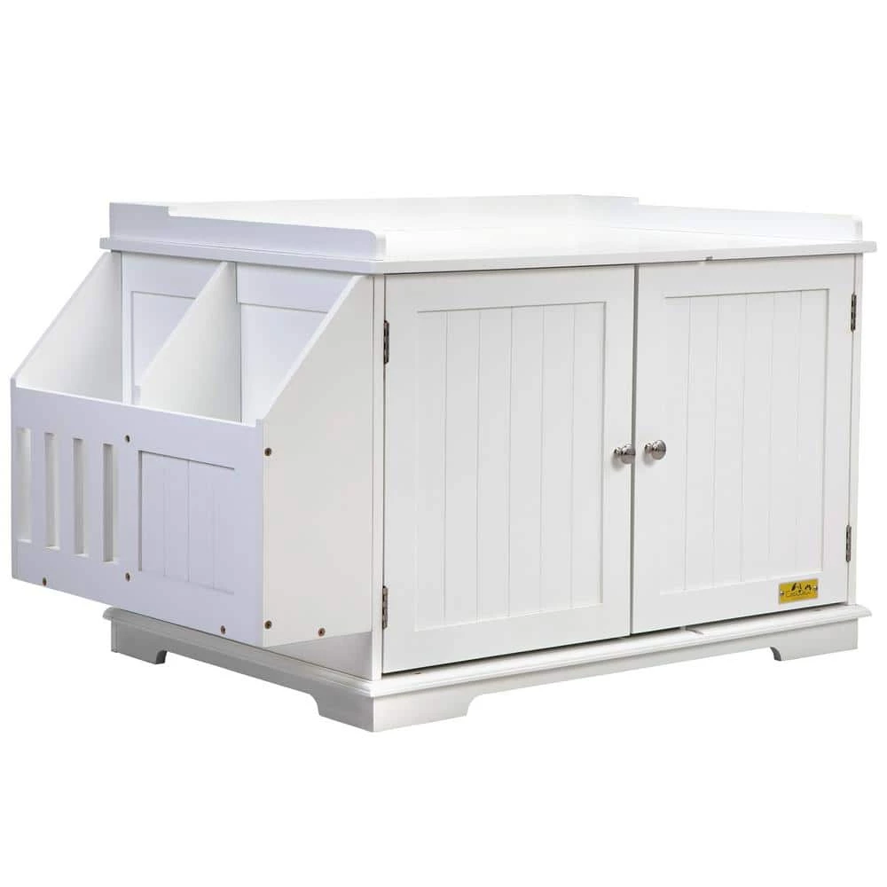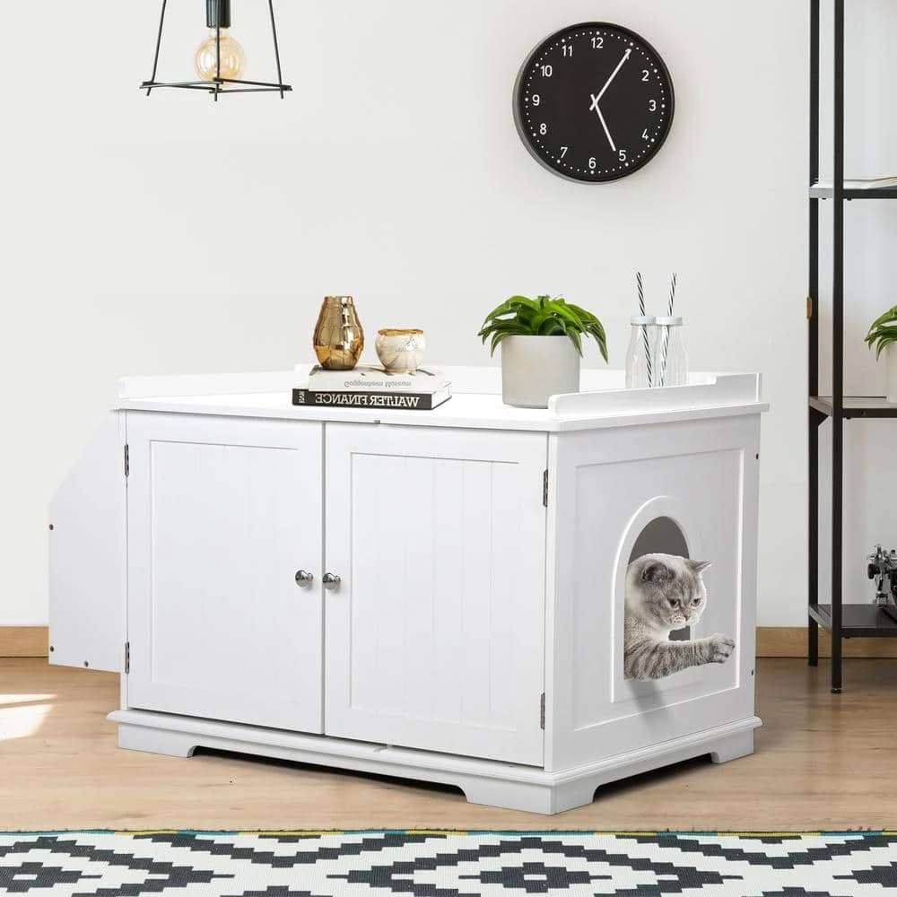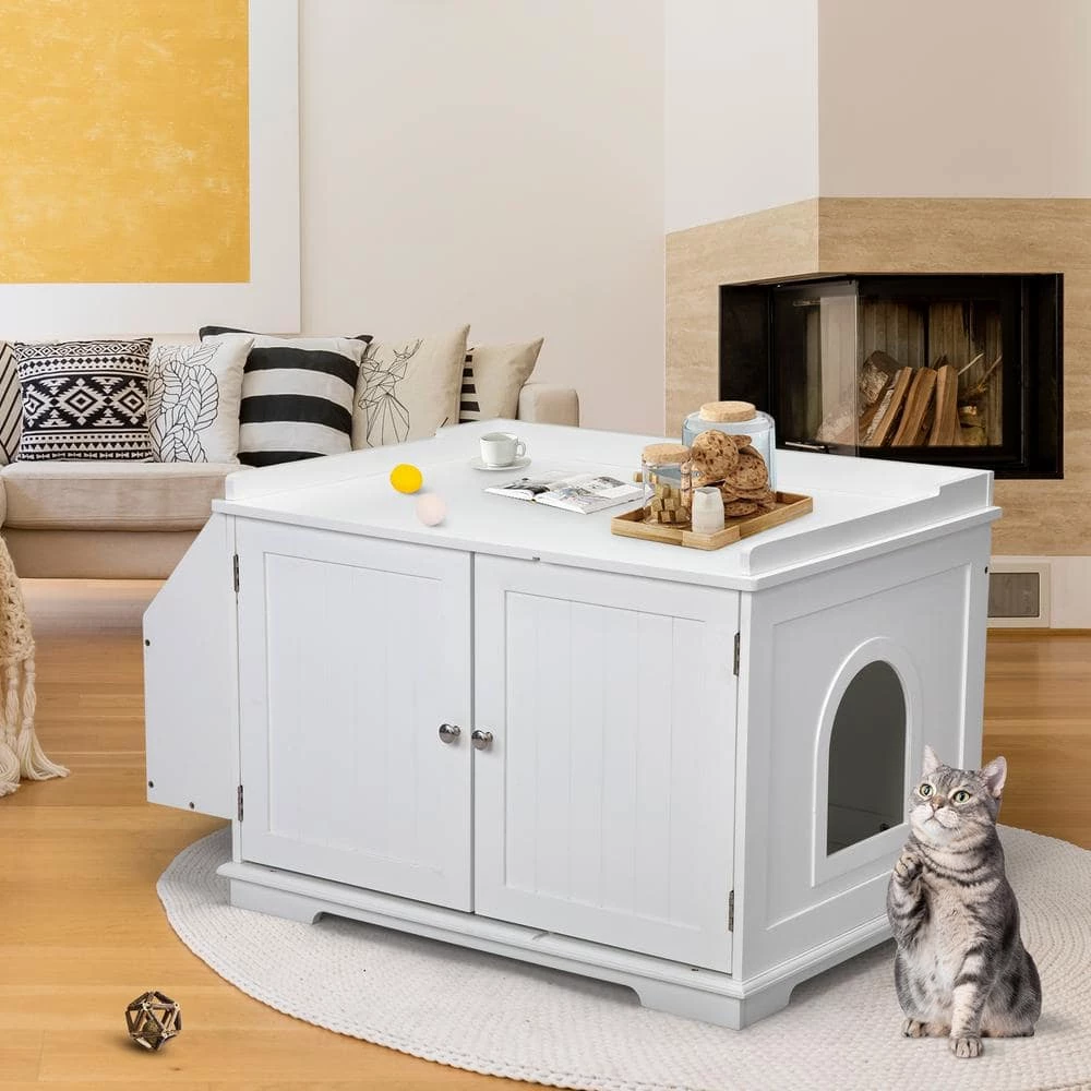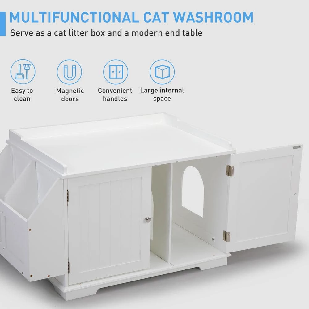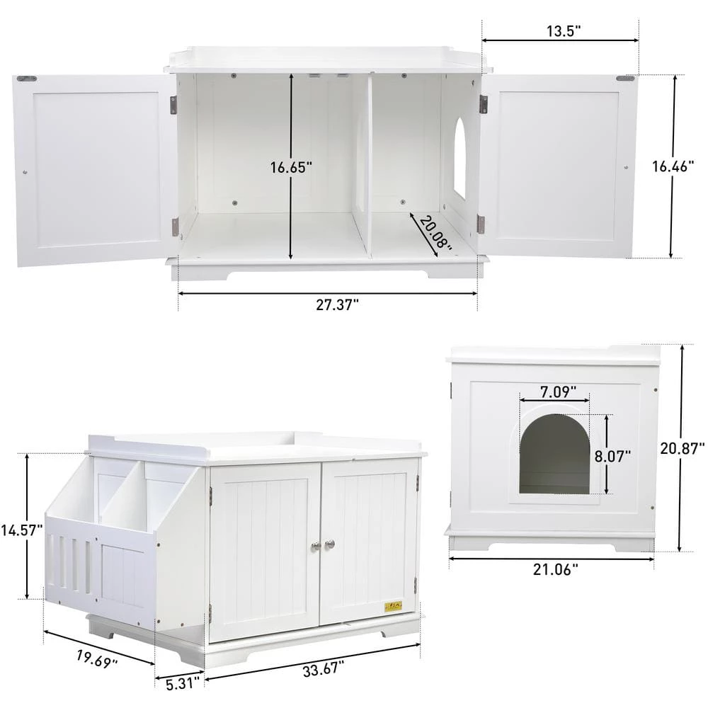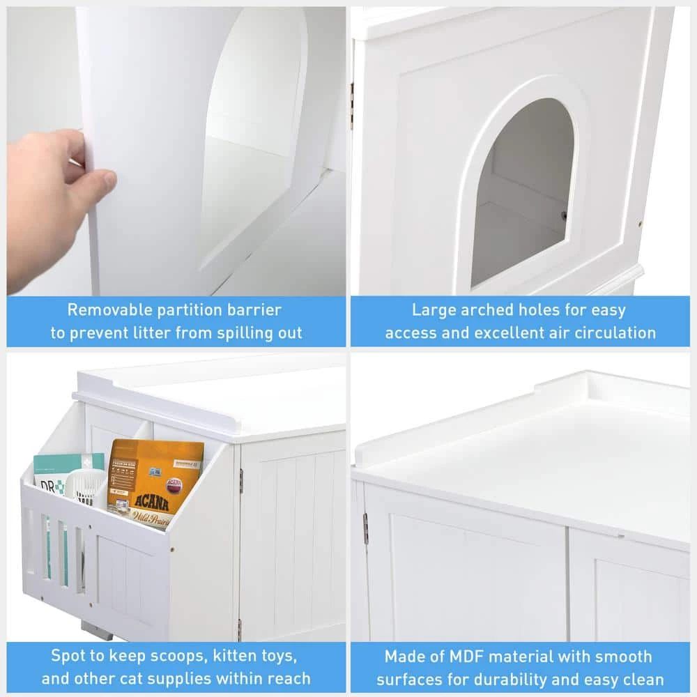 - Thoughtful design doors with knobs construct the front, open them and you can view the inside, convenient to tidy up your cat’s supplies, 2 arched doors lead to the side exit while preventing cat litter from being kicked out of the box