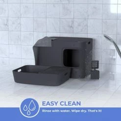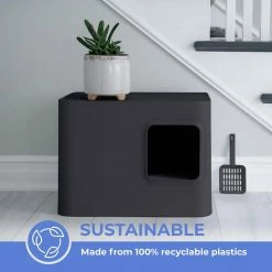 The Meowy Studio Cat Litter Box has a beautiful design that blends seamlessly with any interior style. It has a modern elevated design that accents any space and offers a balance between functionality and style for both cats and cat owners. It has closed structure effectively blocks odor. It is sustainably made from 100% recyclable high grade plastics.