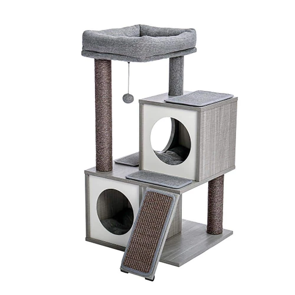 Stability is always priority. The bottom base is strengthened that ensure its stability of the whole cat tree. The extra large top perch with raised rim offer maximum comfort for feline friend while they are lounging and looking out window They will definitely enjoy it. The dual condos is covered with ultra soft plush and the enclosed design creating a sense of security provide them a quiet place to curl up for snoozing.