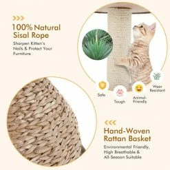 This exquisite cat tree, woven by hand-woven water hyacinth, has candy, platform, durability and easy maintenance, adding a touch of elegance to your home space. This is also a paradise for cats to have fun and relax. Cat and the platform have detachable cushions, so that your kitten can have a comfortable experience when resting. The sisal column is designed to satisfy the cat’s climbing and scratching nature and avoid scratching your furniture.