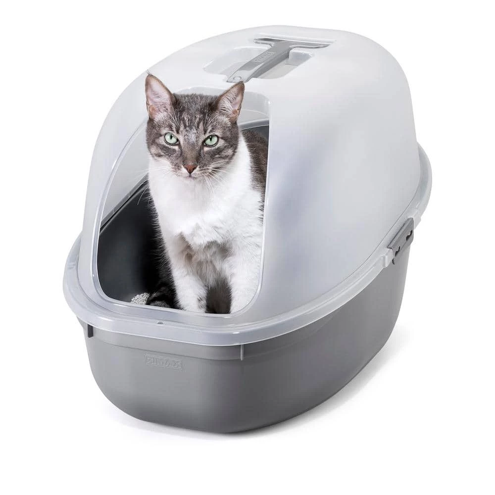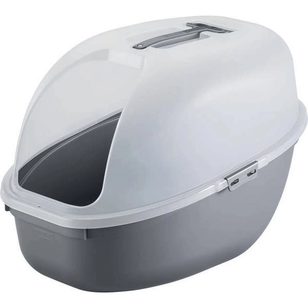 Hooded Cat Litter Box with Scoop finished in Light Gray/Metallic Gray is made from heavy-duty polypropylene resin construction which is rust, stain and scratch resistant. It is ideal for providing your cat with some private space to take care of business. The dynamic design with high side keep your litter contained and the curved sides makes it easy to scoop out and clean the litter with the scoop that is included and attaches to the lid for easy storage. The litter box has an ergonomic handle that is secured with 2-locks, facilitating the mobility of the litter box.