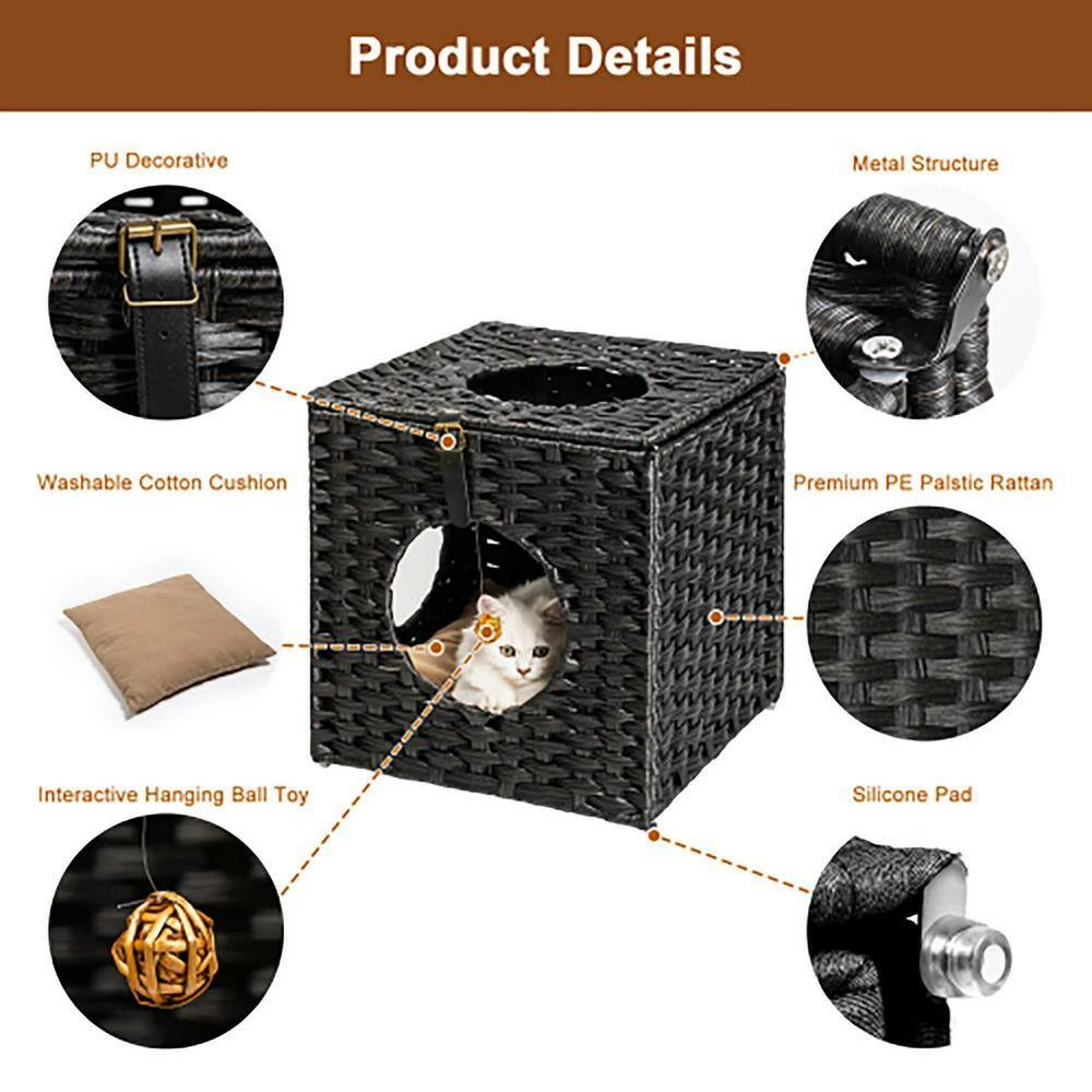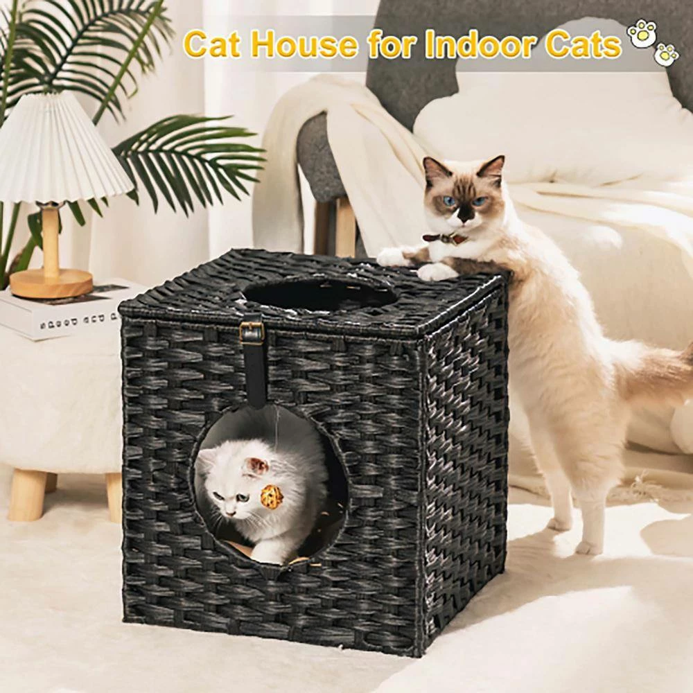 This is our newly designed rattan cat house, the design is also inspired by rattan furniture, so you can also use this cat house-like furniture, it is easy to match your home decoration style You can also put it on the head of the bed as a bedside table to sleep with the cat. Turn this cat house upside down and use it as a cat tunnel toy to play hide and seek with your feline.