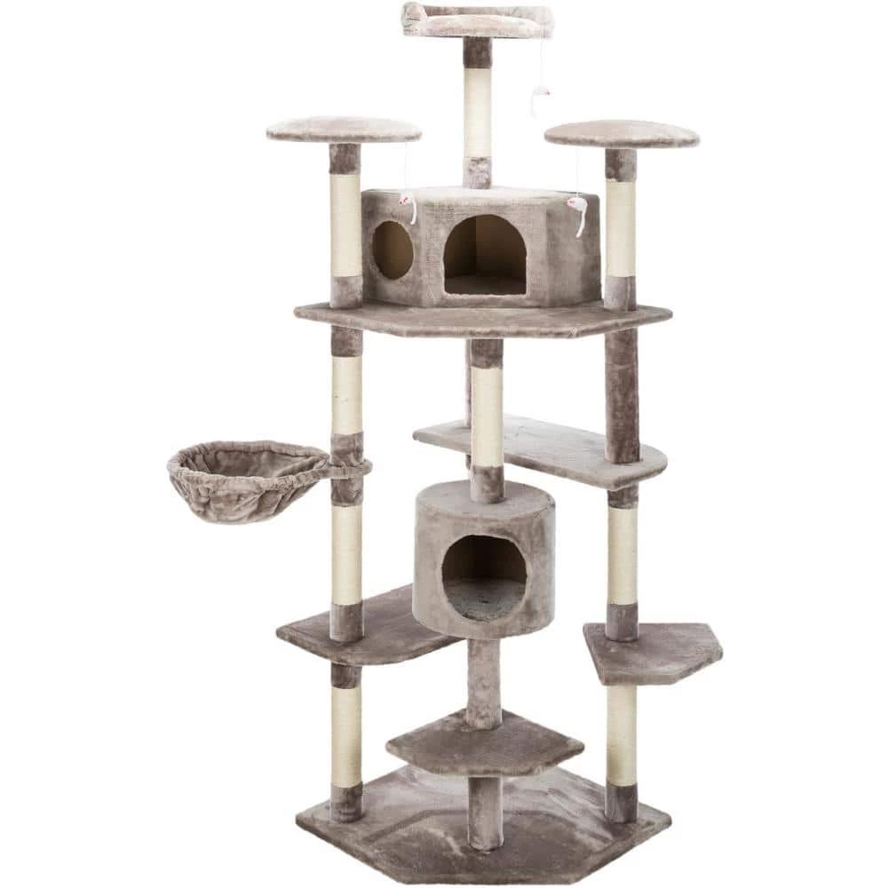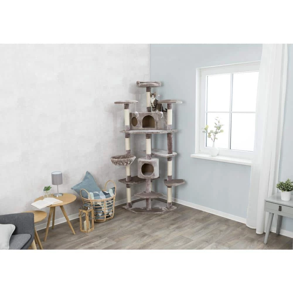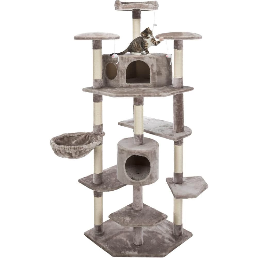 The TRIXIE Roma Cat Tower xL is a fun-filled, feline playground, it will provide endless opportunities for cats to play, explore, scratch or just relax. Felines can sharpen their claws on the 3 tall scratching columns instead of on your furniture or carpet, giving them a healthy outlet for their scratching instincts, the scratching columns are covered in durable sisal, if a nap or place to hide is in order, the cat can crawl inside 1 of the 2 kitty condos or the cozy hammock. Feeling a little spunky? Jump, climb or perch atop the plush covered platforms and lie in wait for unsuspecting prey or simply enjoy the view. For added comfort the top 3 platforms are padded. Also included are 4 dangling toys that are sure to pique your curious cat’s interest. Suitable for cats of all ages and activity levels.
