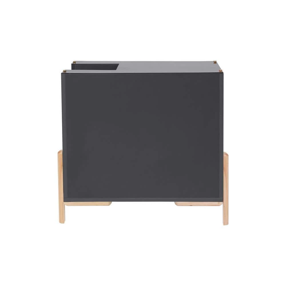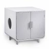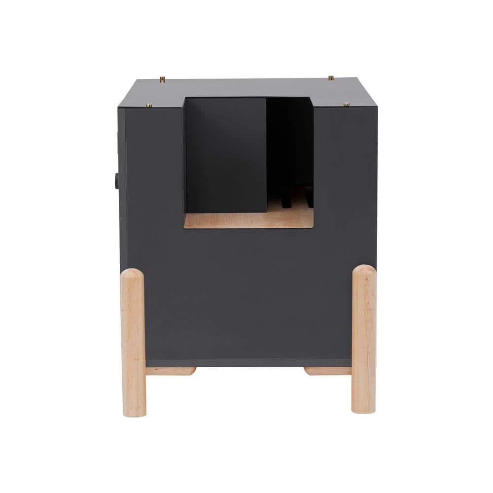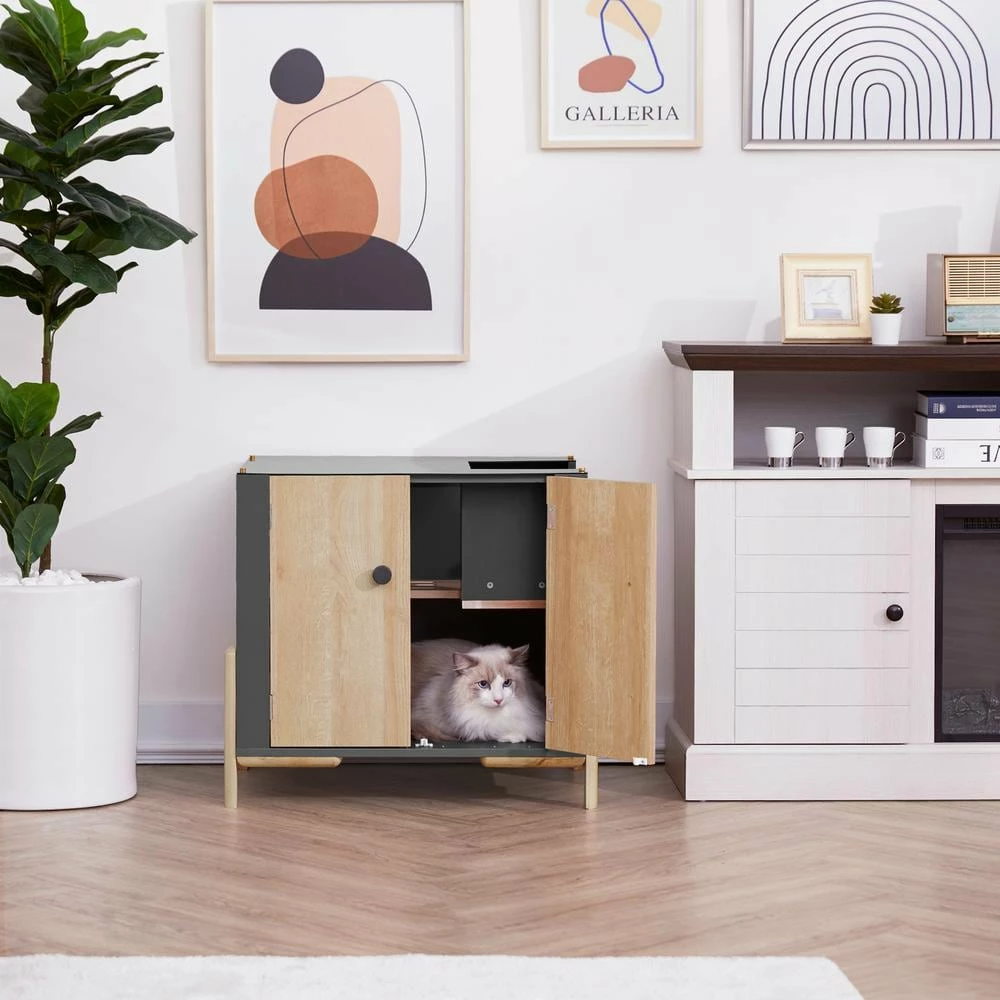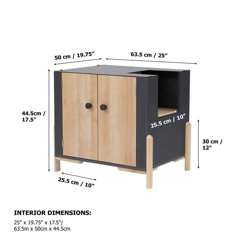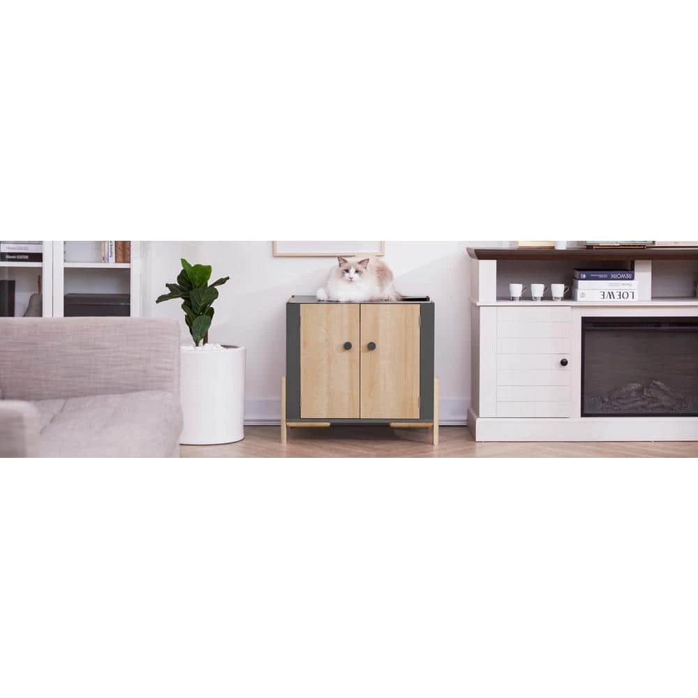 - Included: contemporary mid-century-inspired litter box enclosure with double doors, top side entrance, elevated legs and slatted walkway
