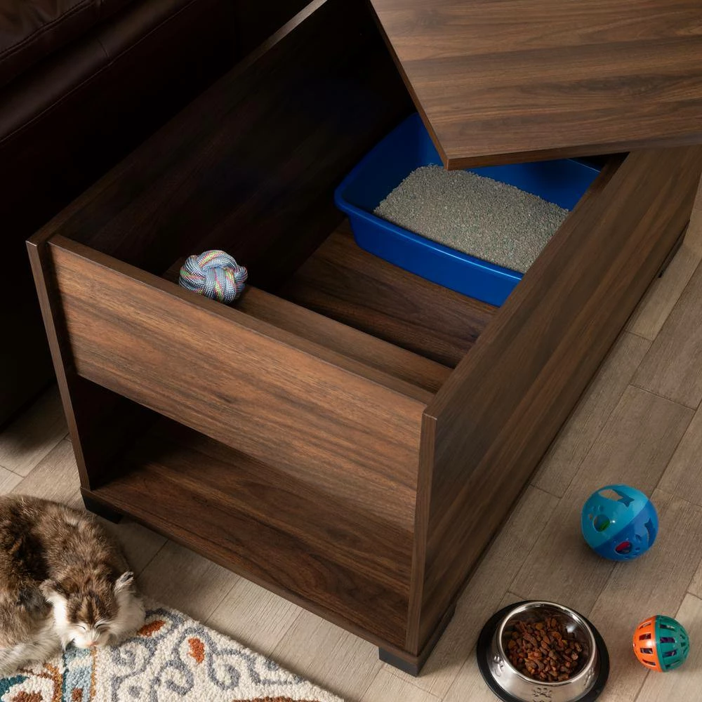 Solve the needs of your cat with the utility of the Skylar cat house. Made in Malaysia, this handy piece provides a large and secluded place to store a litter box, along with an inner shelf to store supplies. A side entrance gives your cat easy access, while a removable top makes cleaning a breeze. The Skylar requires assembly and is finished in a smooth walnut brown that is easy to coordinate with any color scheme. Acting as a private and functional area for your cat’s needs, the Skylar cat house is an excellent addition for any cat owner. A litter box is not included.