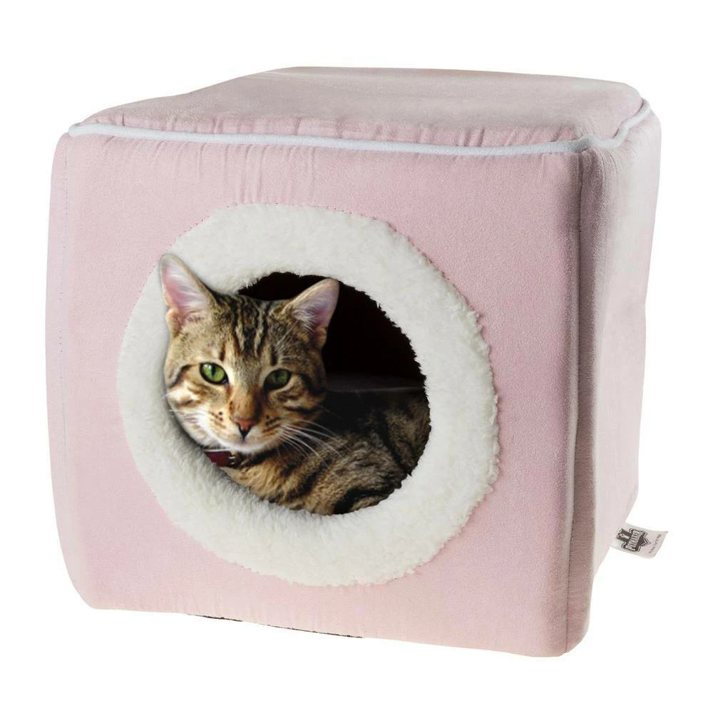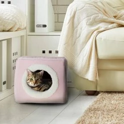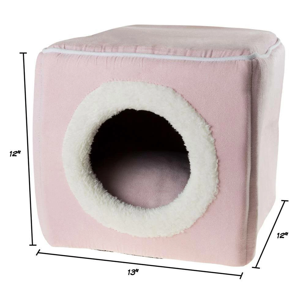 - PRODUCT DETAILS – This covered kitty house is recommended for cats, kittens, and pets 16 lbs or less. Dimensions: 13 inches (Length) x 12 inches (Width), 12 inches (Height). Color: Pink. Material: 60% Polyester, 40% Polyurethane FoamTo wash: Hand washable in cold water.