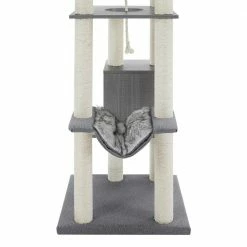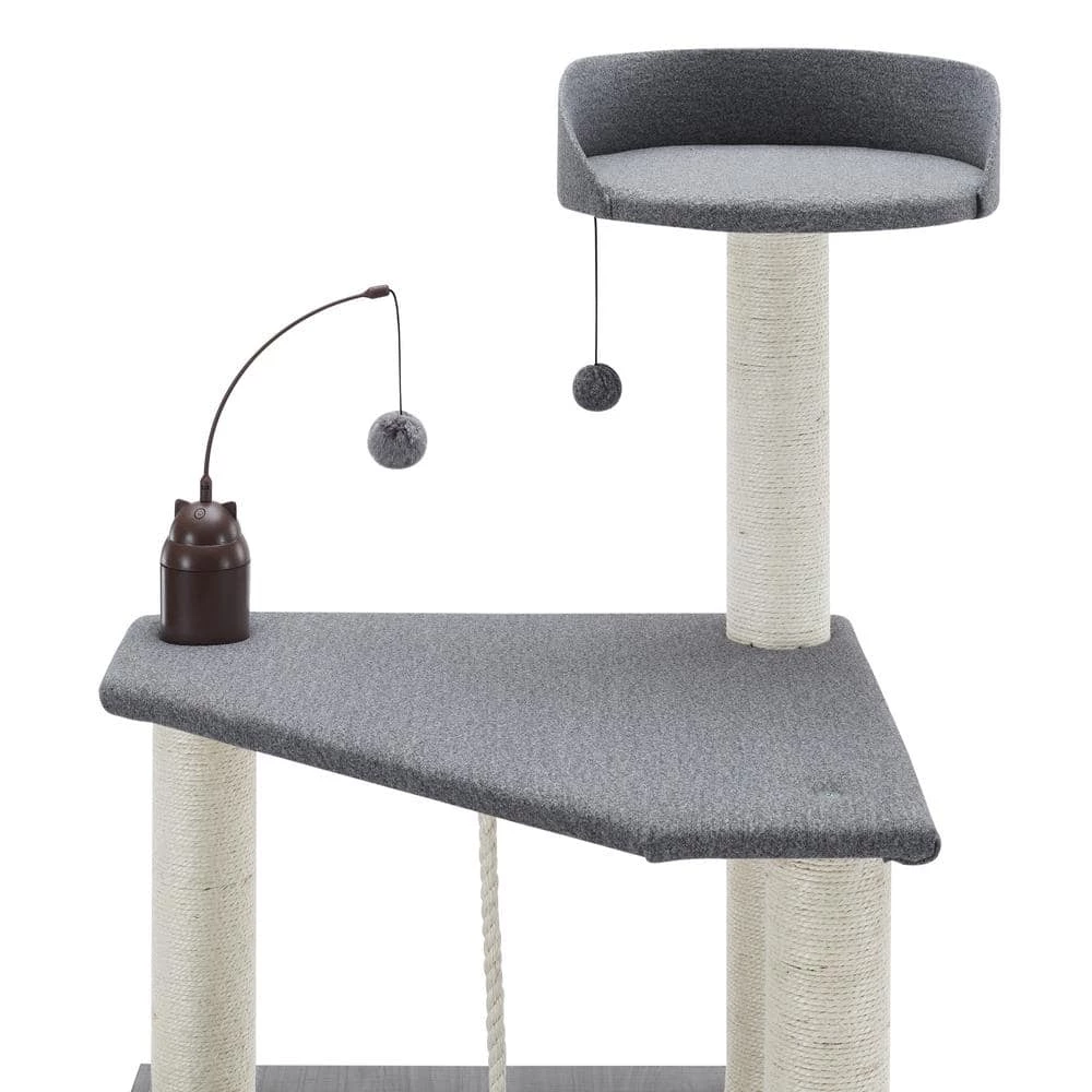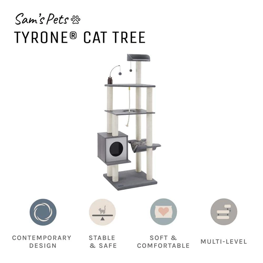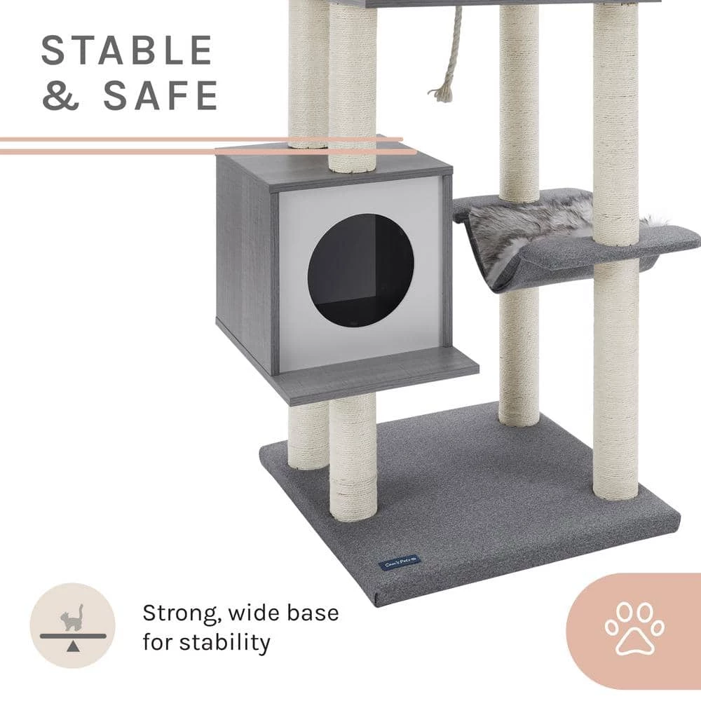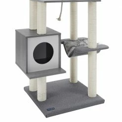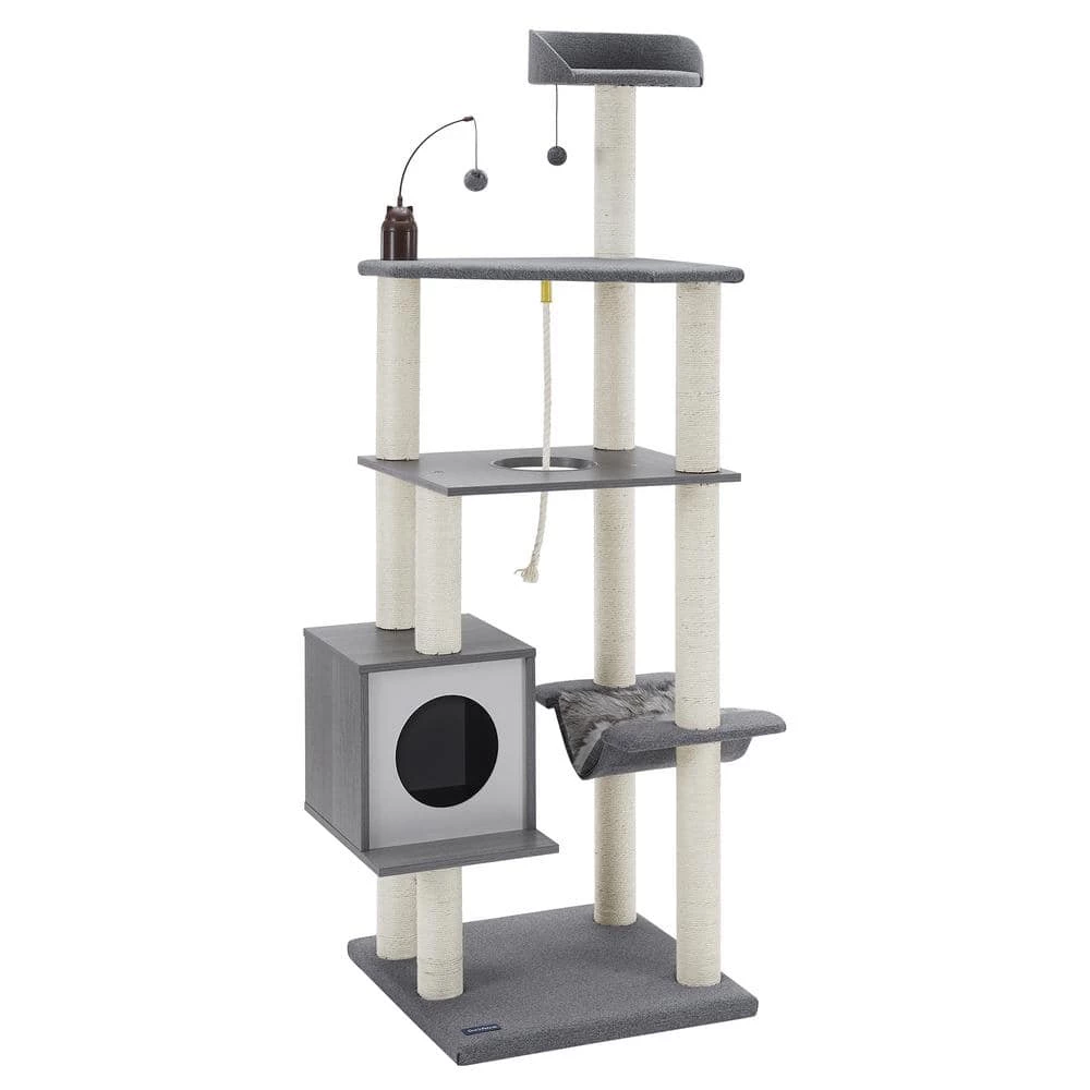 The Tyrone Cat Tree includes several climbing features, scratching posts, a hammock, a cozy enclosure, and built-in toys. When it’s time to rest, your cat may choose to relax on one of several perches or curl up within the hammock. Plush, polyester fur ensures maximum comfort, while the stylish shade of gray will suit any home. Constructed with high-quality materials it’s sturdy, easy to assemble, and large enough for multiple cats to enjoy.